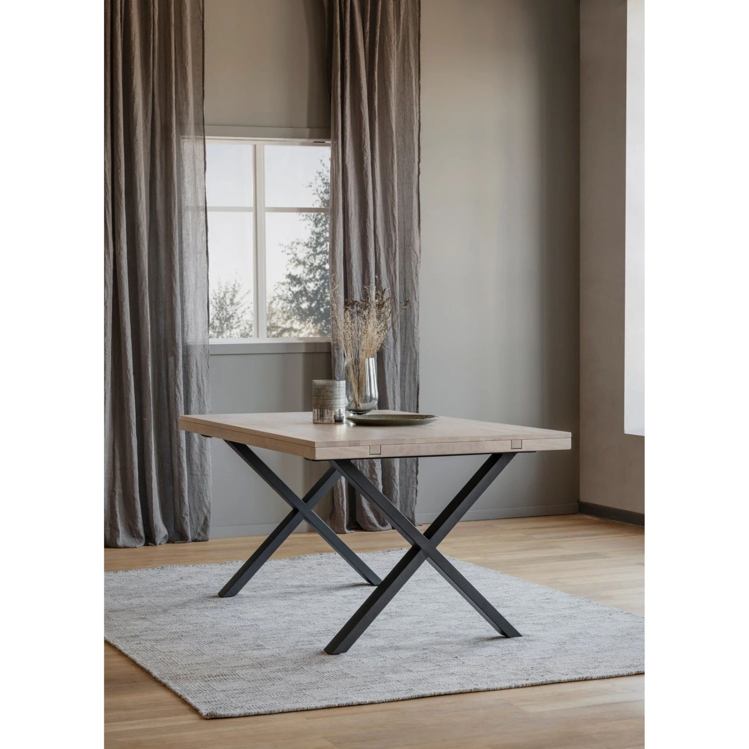 Tyylikäs Brooklyn-ruokapöytä x-mallisilla metallijaloilla on upean näköinen, skandinaaviseen makuun sopiva tammikantinen ruokapöytä. Metallijalkainen ja tukeva Brooklyn-ruokapöytä on moderniin tyylikäs, mutta myös käytännöllinen, sillä se mukautuu tarpeisiisi henkilömäärän muuttuessa. Myös X-jalkaista Brooklyn-ruokapöytää voit tarvittaessa jatkaa