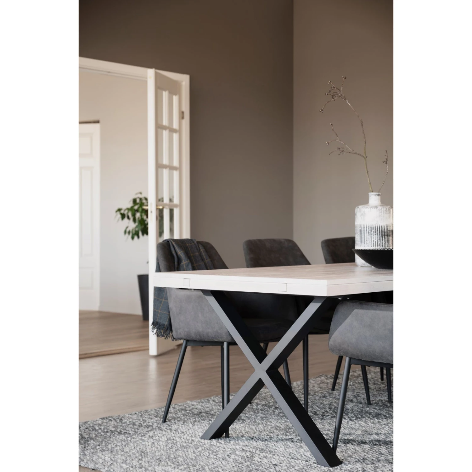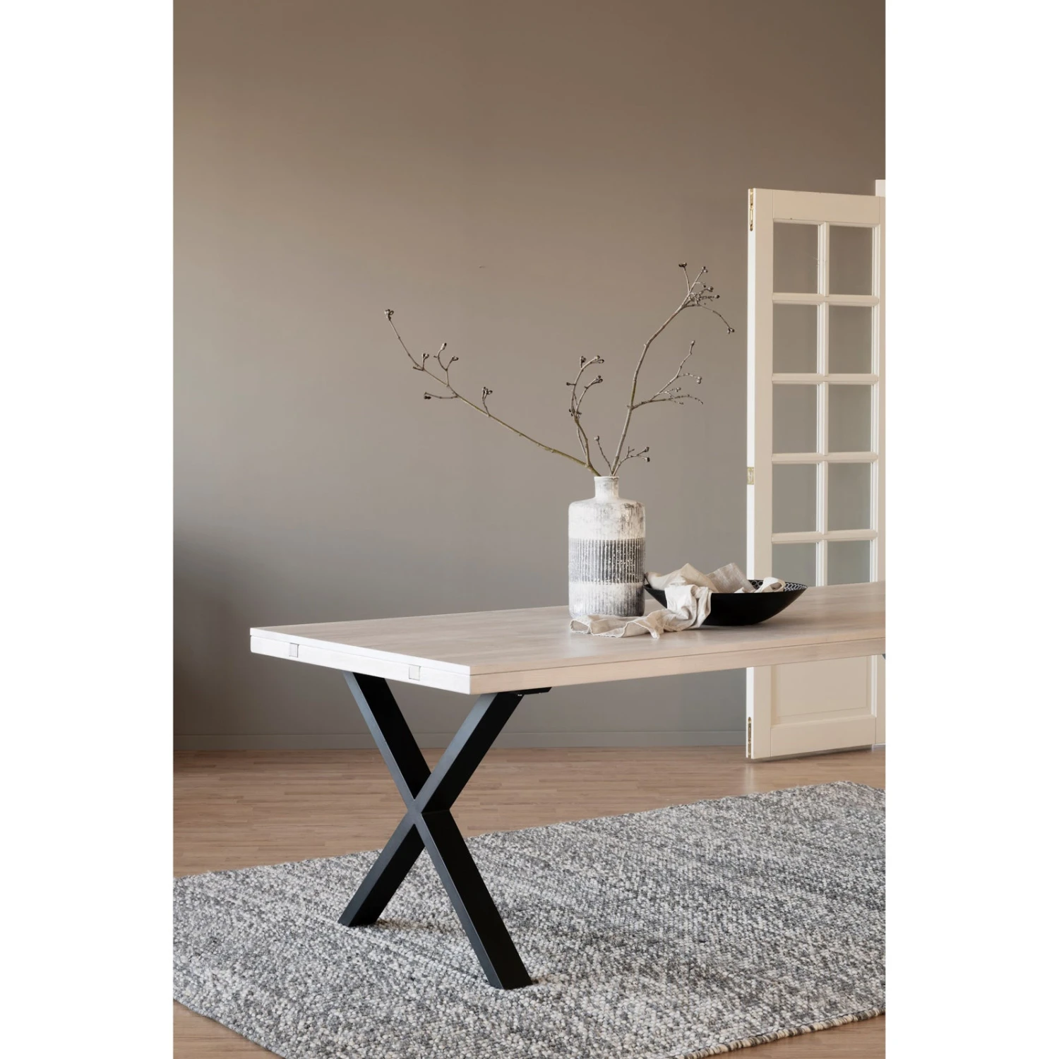 Tyylikäs Brooklyn-ruokapöytä x-mallisilla metallijaloilla on upean näköinen, skandinaaviseen makuun sopiva tammikantinen ruokapöytä. Metallijalkainen ja tukeva Brooklyn-ruokapöytä on moderniin tyylikäs, mutta myös käytännöllinen, sillä se mukautuu tarpeisiisi henkilömäärän muuttuessa. Myös X-jalkaista Brooklyn-ruokapöytää voit tarvittaessa jatkaa
