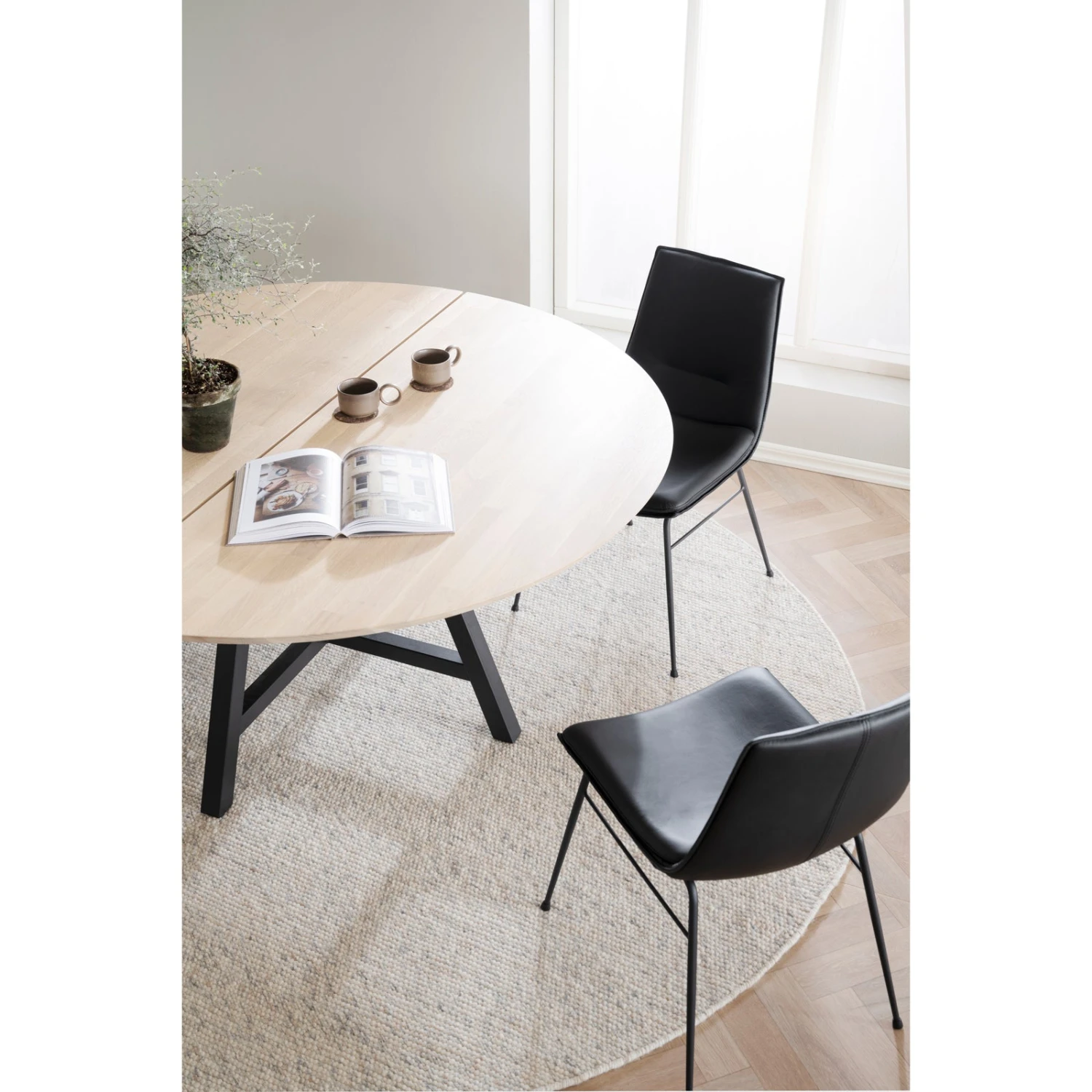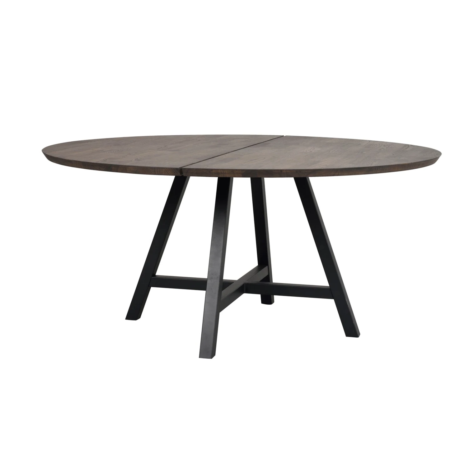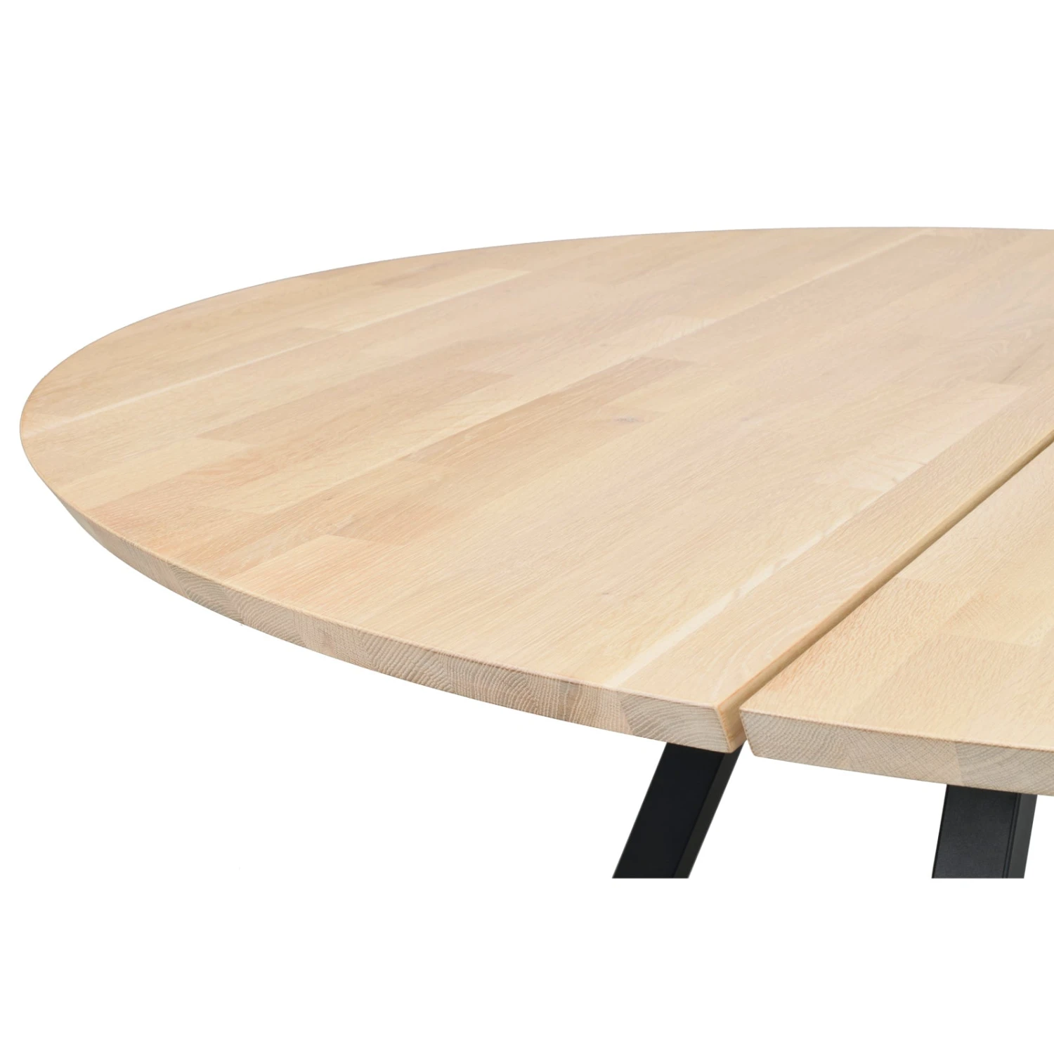 Carradale-pöydän pöytälevy on laadukasta massiivitammea, joka on jaettu tyylikkäästi kahteen osaan. Pyöreä Carradale on tyylikkään yksinkertainen, mutta sen jykevät, mustat metallijalat tuovat ulkonäköön särmikkyyttä. Nämä tukevat A-muotoiset jalat pitävät pöydän vakaasti pystyssä.