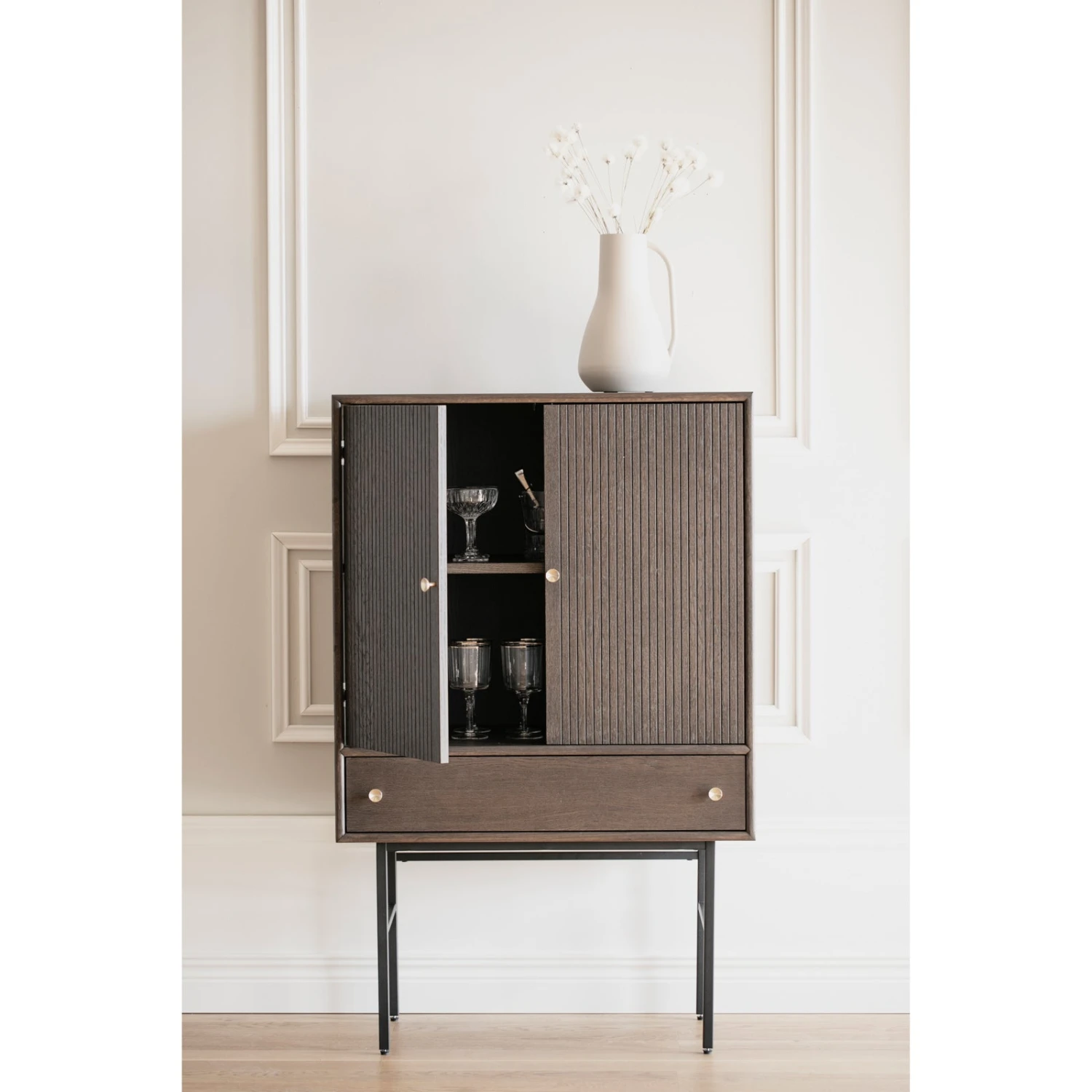 Tyylikäs Clearbrook-kaappi on suoralinjainen säilytyskokonaisuus, jonka uritetut ovet ja messingin väriset vetimet toimivat kauniina katseen vangitsijoina. Kaappi on ruskeaksi petsattua tammiviilua ja sen ohuet mustat jalat tuovat muuten jykevän säilytyskalusteen ilmeeseen keveyttä. Kaapissa on runsaasti säilytystilaa ja säilytystilan korkeutta voi säätää liikuteltavilla hyllytasoilla. Kaapin ovet ja laatikot sulkeutuvat pehmeästi Soft Close -mekanismin ansiosta ja lisäävät käyttömukavuutta.
