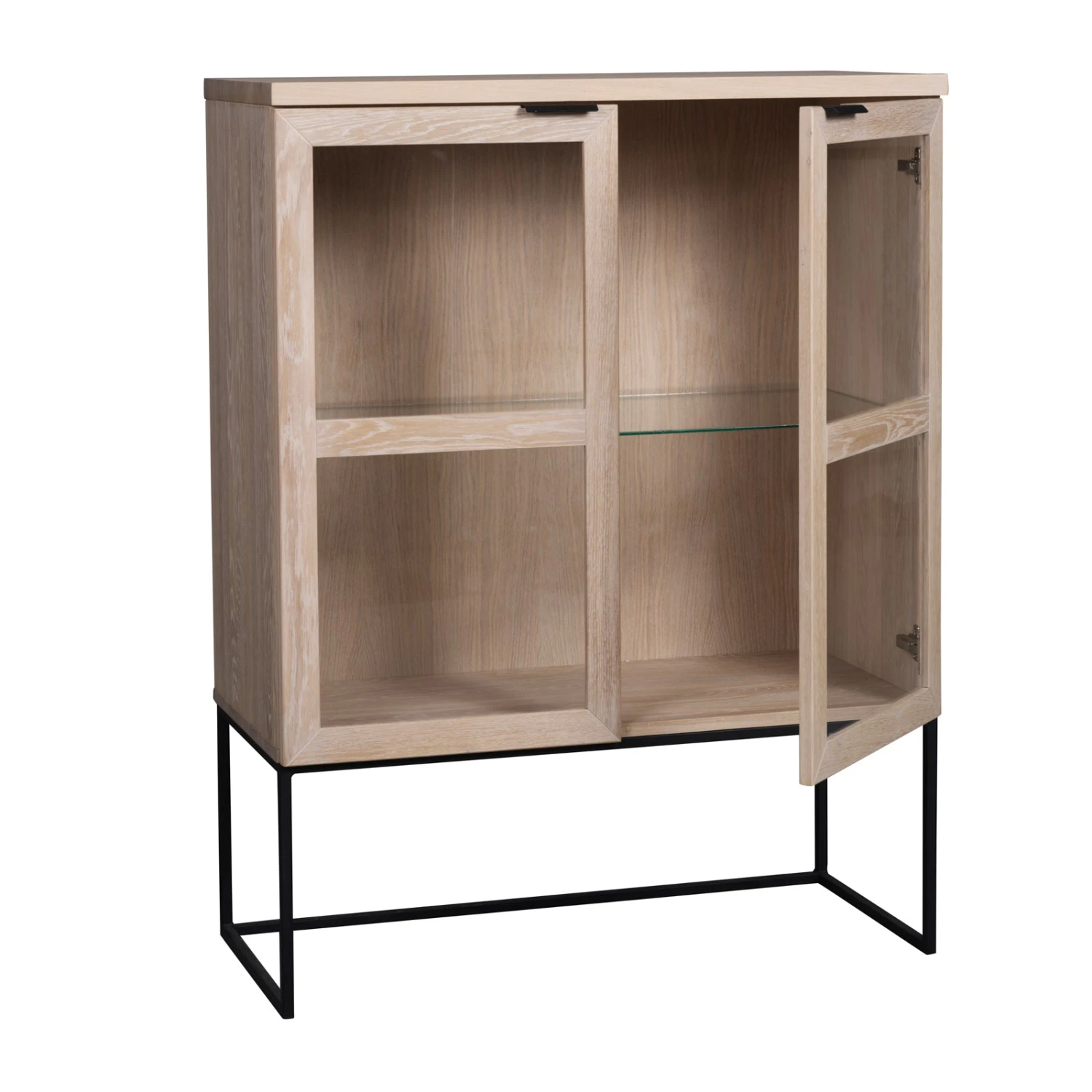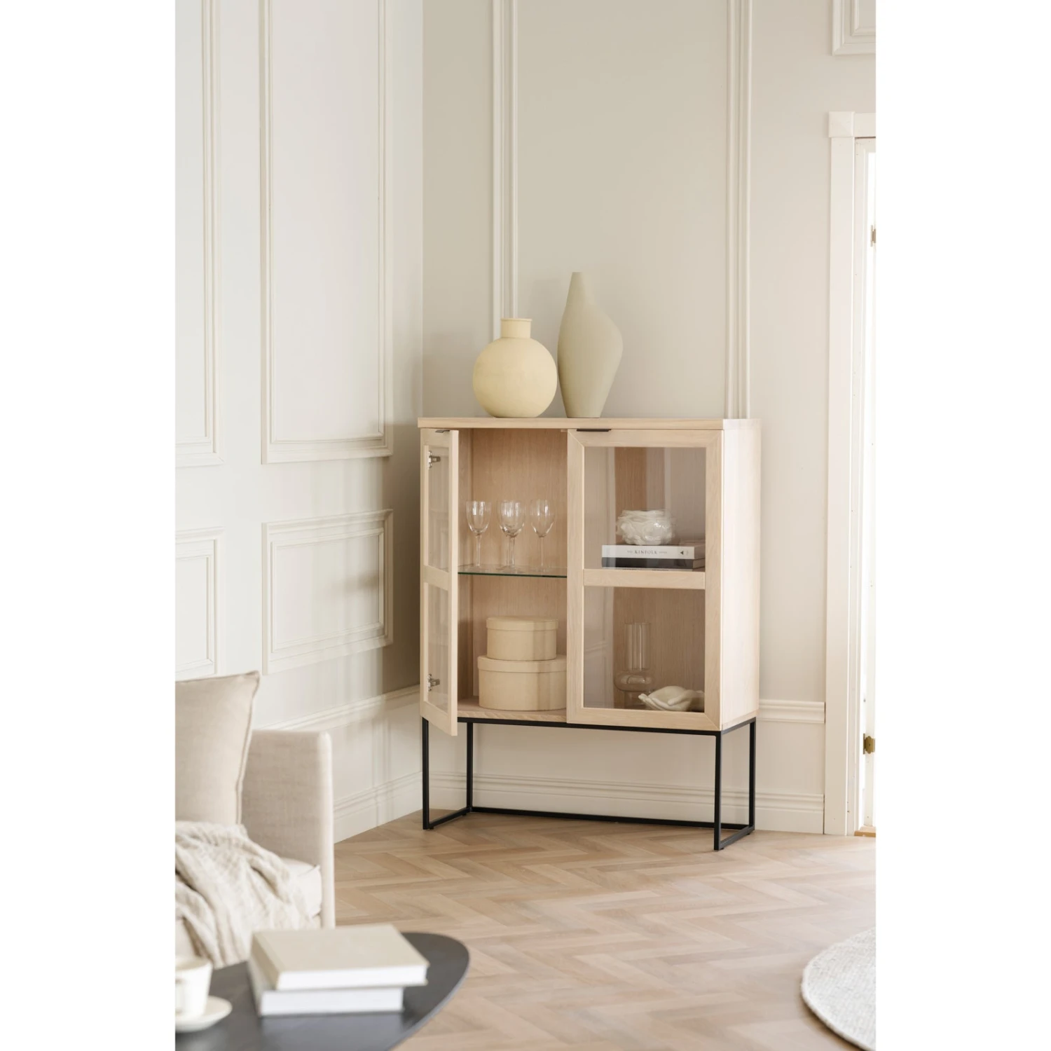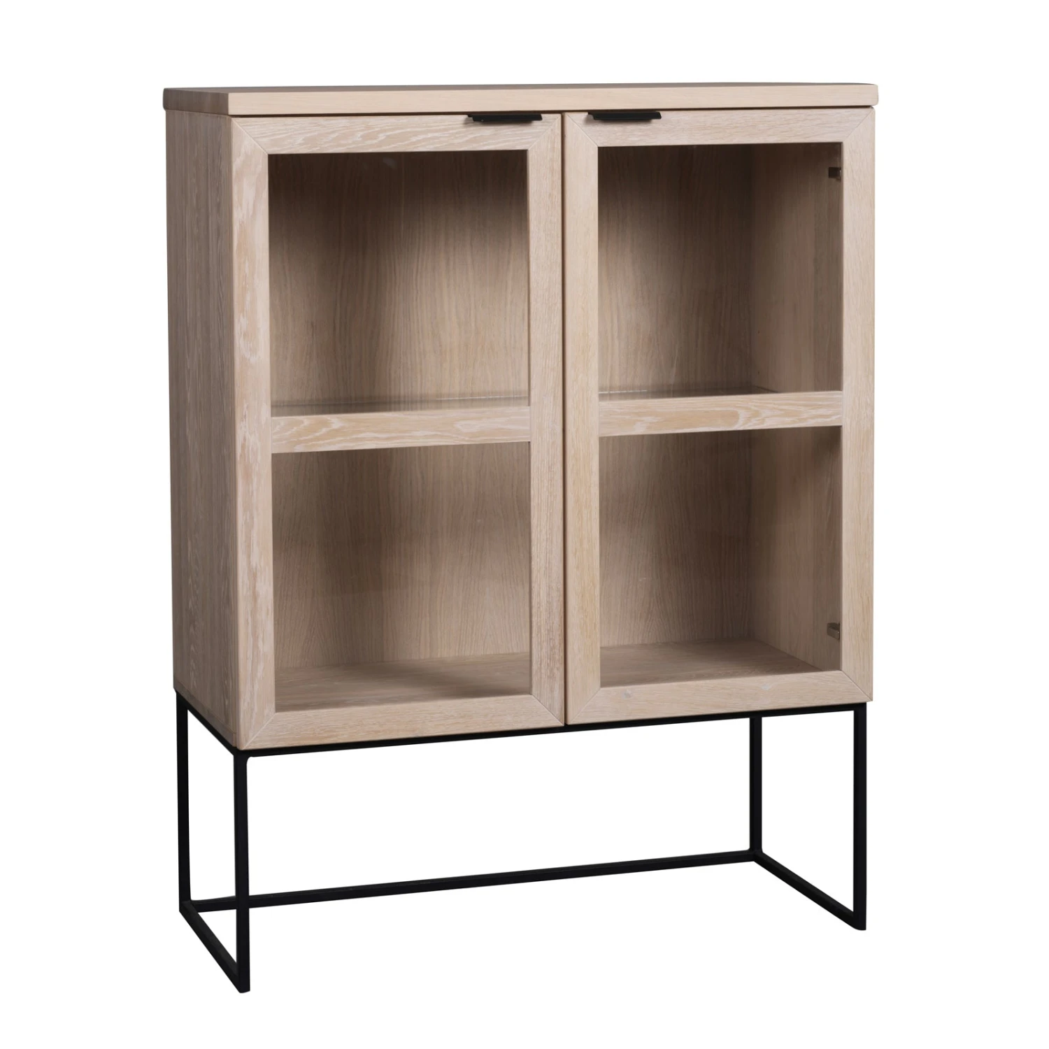 Everett-vitriini on upea matala lasikaappi ohuilla metallijaloilla. Suoralinjainen lasivitriini on valmistettu vaaleasta tai mustaksi lakatusta harjatusta luonnonmukaisesta tammesta ja siinä on mustat jauhemaalatut metallijalat. Ohuet tyylikkäät jalat keventävät modernisti puisen säilytyskalusteen ulkoasua.