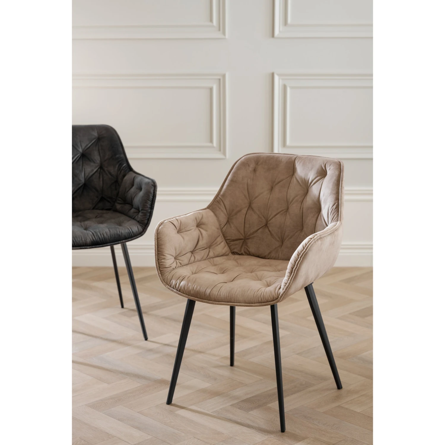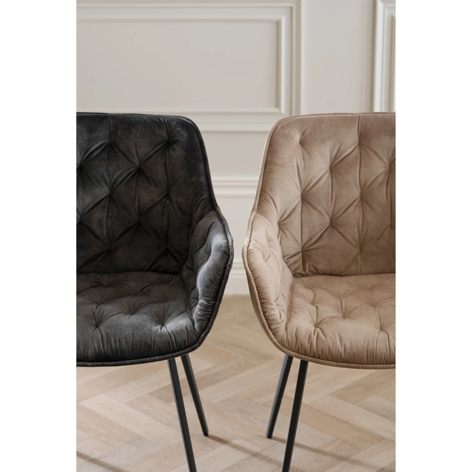Käsinojallisen Gilroy-tuolin yksityiskohdissa ei myöskään ole säästelty. Tuolin selkänojaa kaunistavat upeat koristetikkaukset, jotka saavat pehmeän samettikankaan näyttämään ylelliseltä. Mustat, kestävät metallijalat viimeistelevät tyylikkään kokonaisuuden. Lisäksi kaikki tuolin puuosat ovat FSC-sertifioitua puuta, joten tuoli on myös vastuullinen valinta.