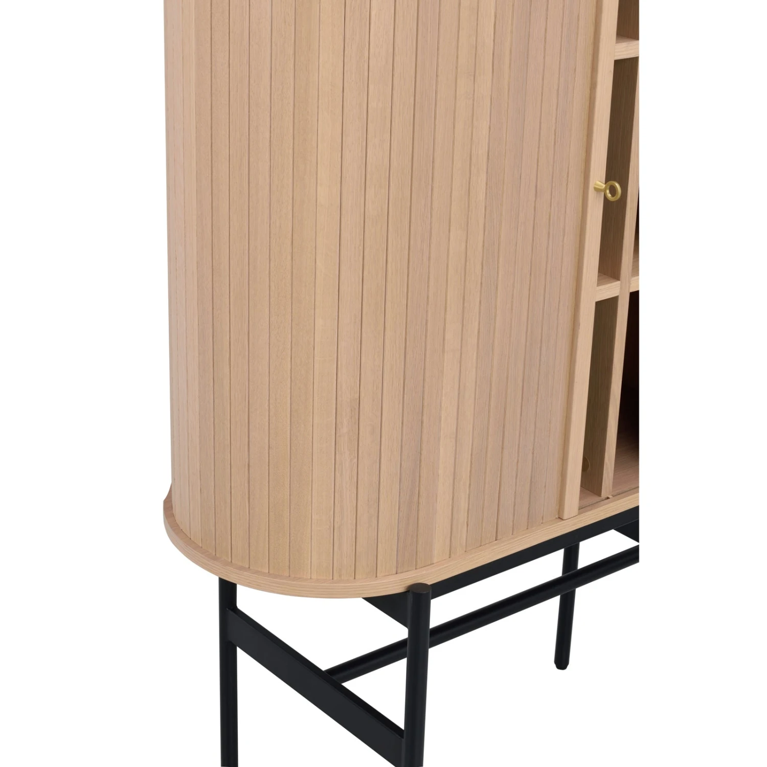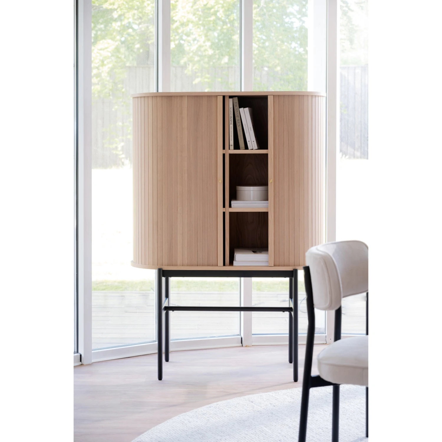 Upeasti muotoiltu Haddington-kaappi on moderni säilytyskokonaisuus liukuovilla. Tyylikäs soikeanmuotoinen ovikaappi koristeellisilla messinginvärisillä vetimillä sopii kaikkiin kodin oleskelutiloihin. Mustat ohuet jalat luovat kontrastia valkotammenväriselle kaapille, joka on varsinainen tilaihme.
