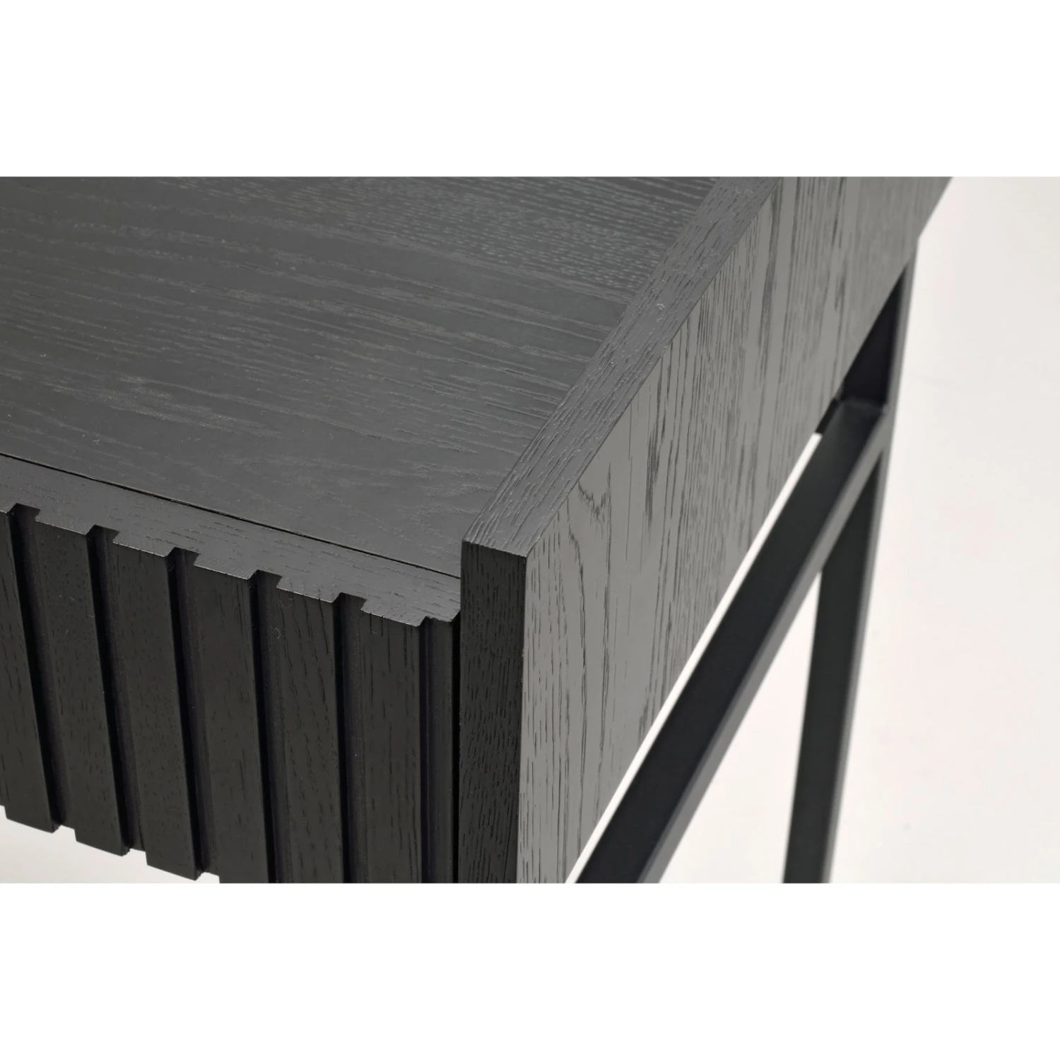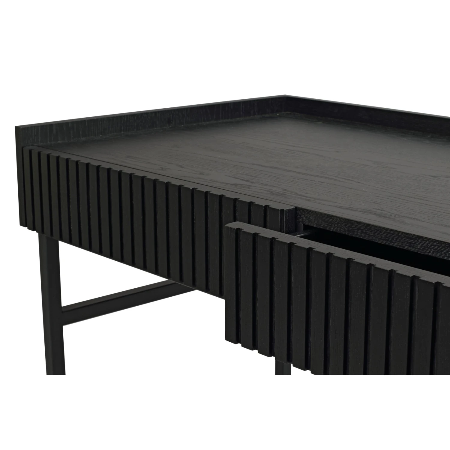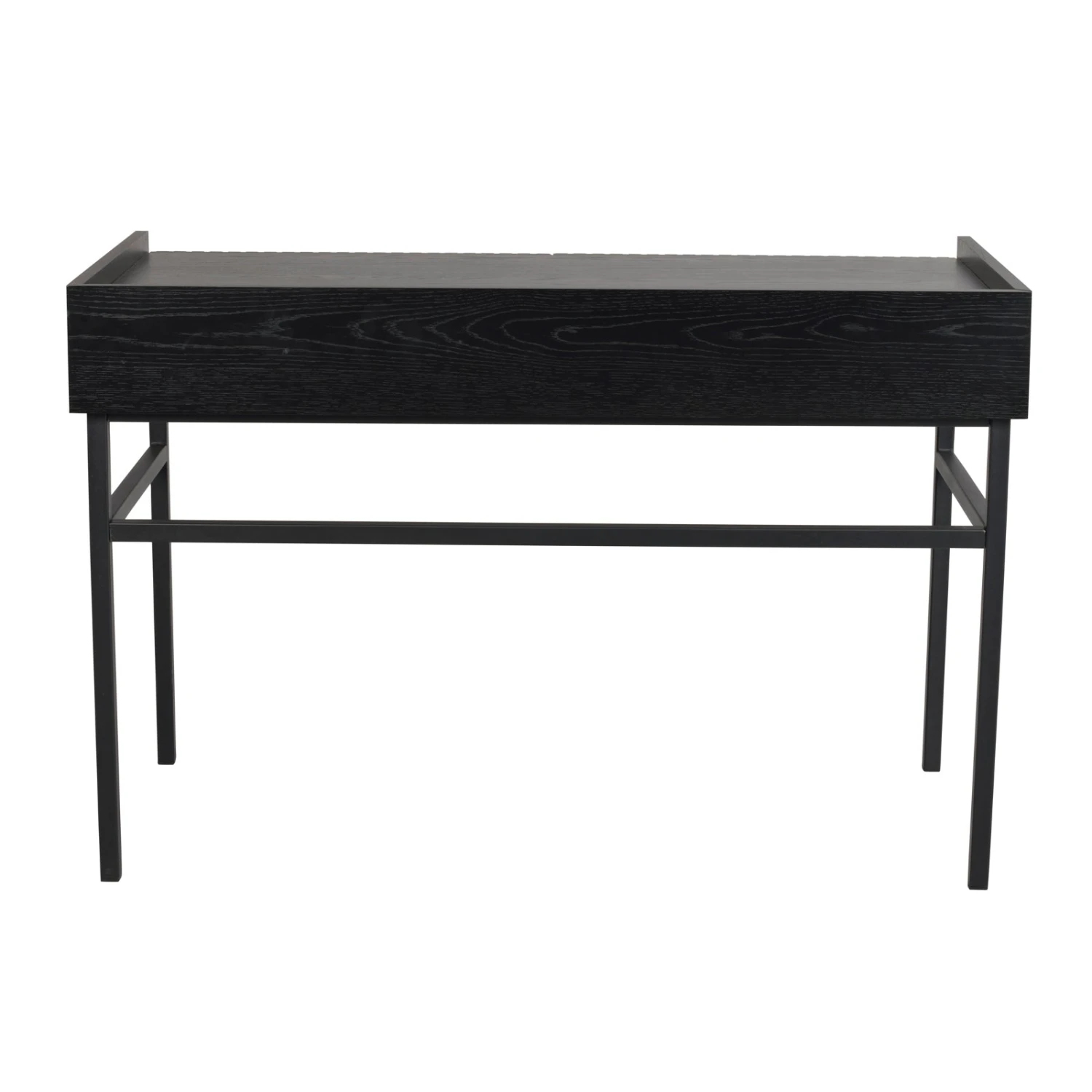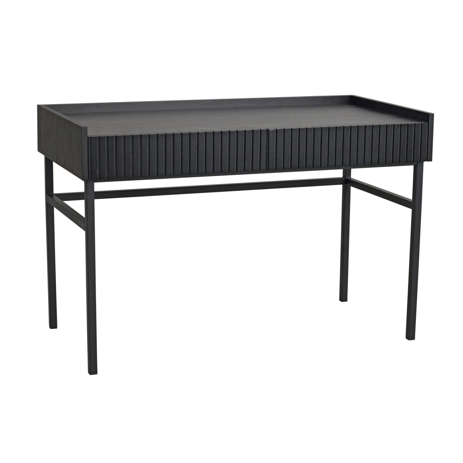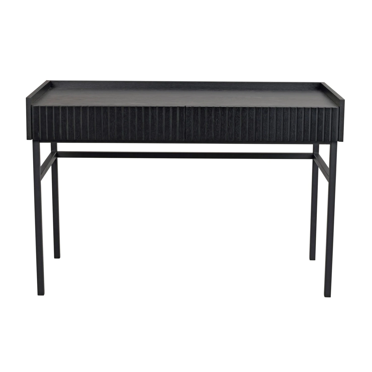 Kokomusta Halifax-työpöytä sopii täydellisesti kotitoimistoon tai pukeutumispöydäksi makuuhuoneeseen. Halifax-työpöytä on mustaksi lakattua tammea ja siinä on ohuet ja ilmavat mustaksi maalatut metallijalat, jotka tuovat työpöydän ilmeeseen ilmavaa keveyttä. Työpöydässä on kaksi laatikkoa, ja voit itse valita lisäätkö laatikoihin kullanväriset vetimet tuomaan työpöydälle erilaista ilmettä. Halifax-työpöydän laatikoiden etupaneeleissa on pystyurat ja hieman upotettu kansiosa piilottaa tärkeät paperit katseilta.