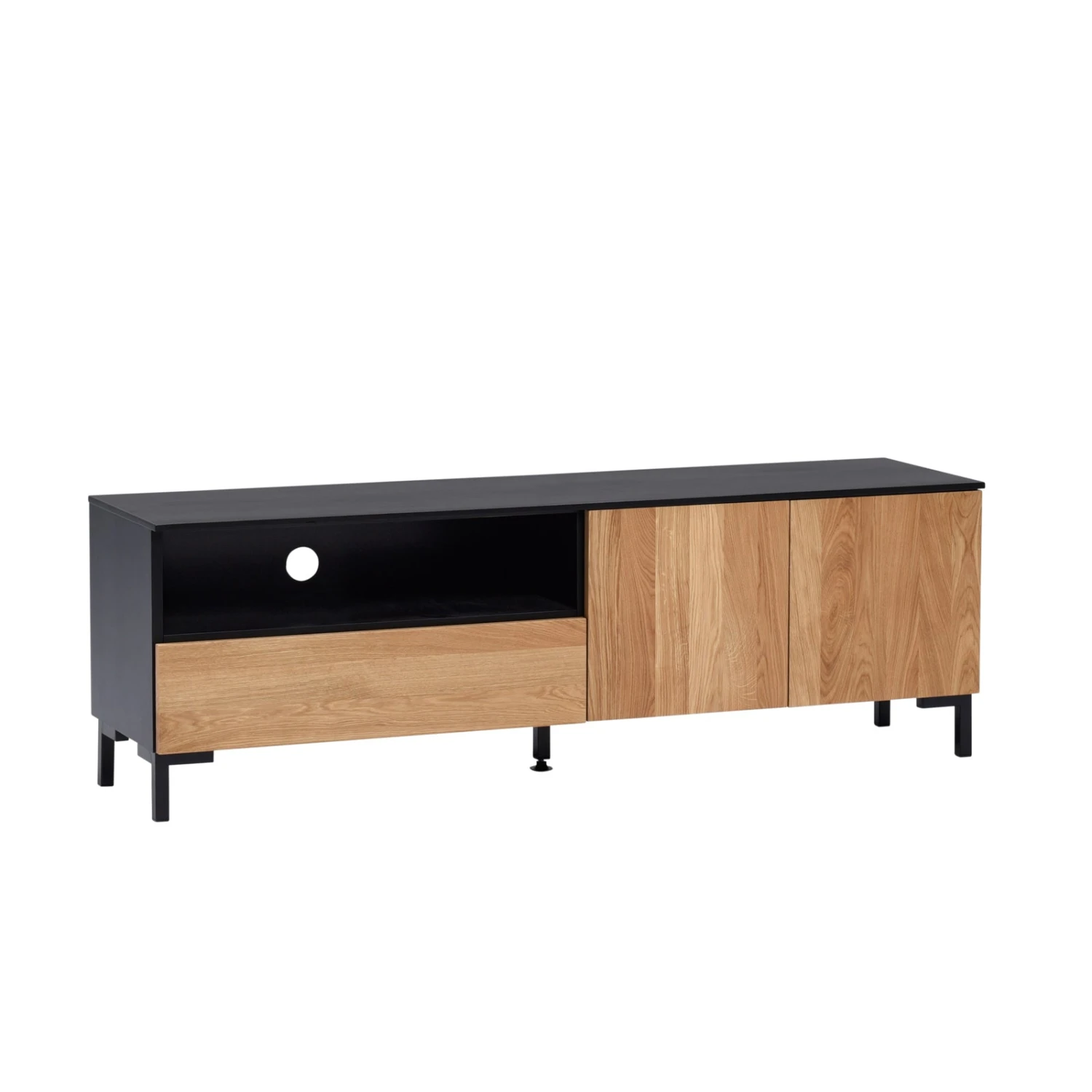 Helsinki-koivusarjan etulevyiltään tammipuinen leveä tv-taso on komea kokonaisuus. Puunvärisiltä osiltaan lakatun tammisessa ja rungoltaan mustaksi sävytetyssä massiivikoivuisessa tasossa on rungon kanssa samanväriset metalliset jalat. Kaksivärinen tv-taso on helppo yhdistää malliston huonekaluihin, joista yhdessä saa koottua linjakkaan kalustekokonaisuuden kokonaan ilman vetimiä. Viimeistelty työnjälki näkyy kalusteissa sisustoja myöten.