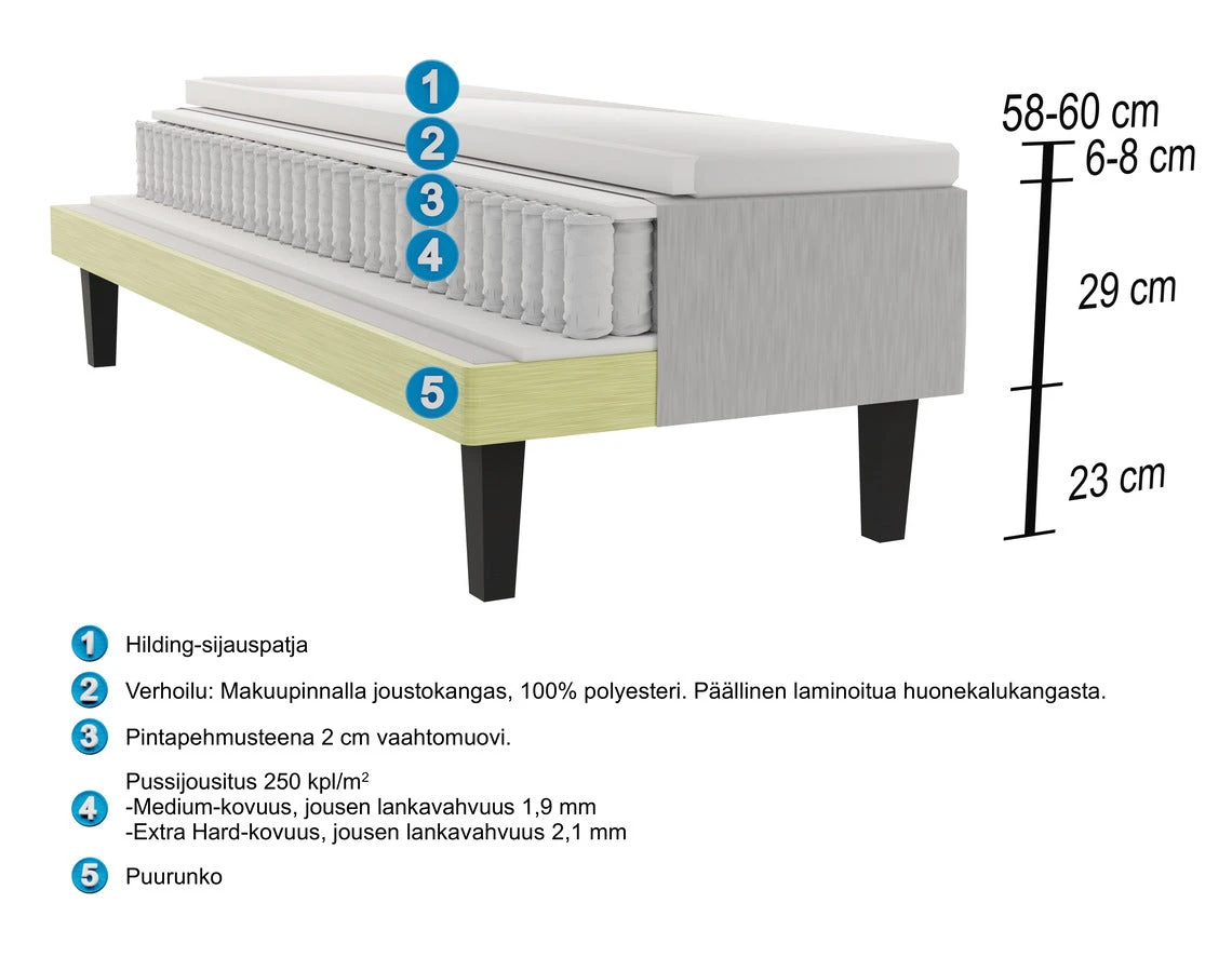 Hilding Original -mallisto tarjoaa tyyliä ja laatua kilpailukykyiseen hintaan! Hilding Original -runkopatjassa on hyvin kehoa myötäilevä ja kestävä pussijousitus, johon voi valita sopivan jousistokovuuden kahdesta vaihtoehdosta. Mallistosta löytyy monen suomalaisen suosima, erittäin jämäkkä kovuus (extra hard). Patjan makuupinnalla on joustokangas, joka parantaa jousiston kykyä muotoutua kehon mukaan.