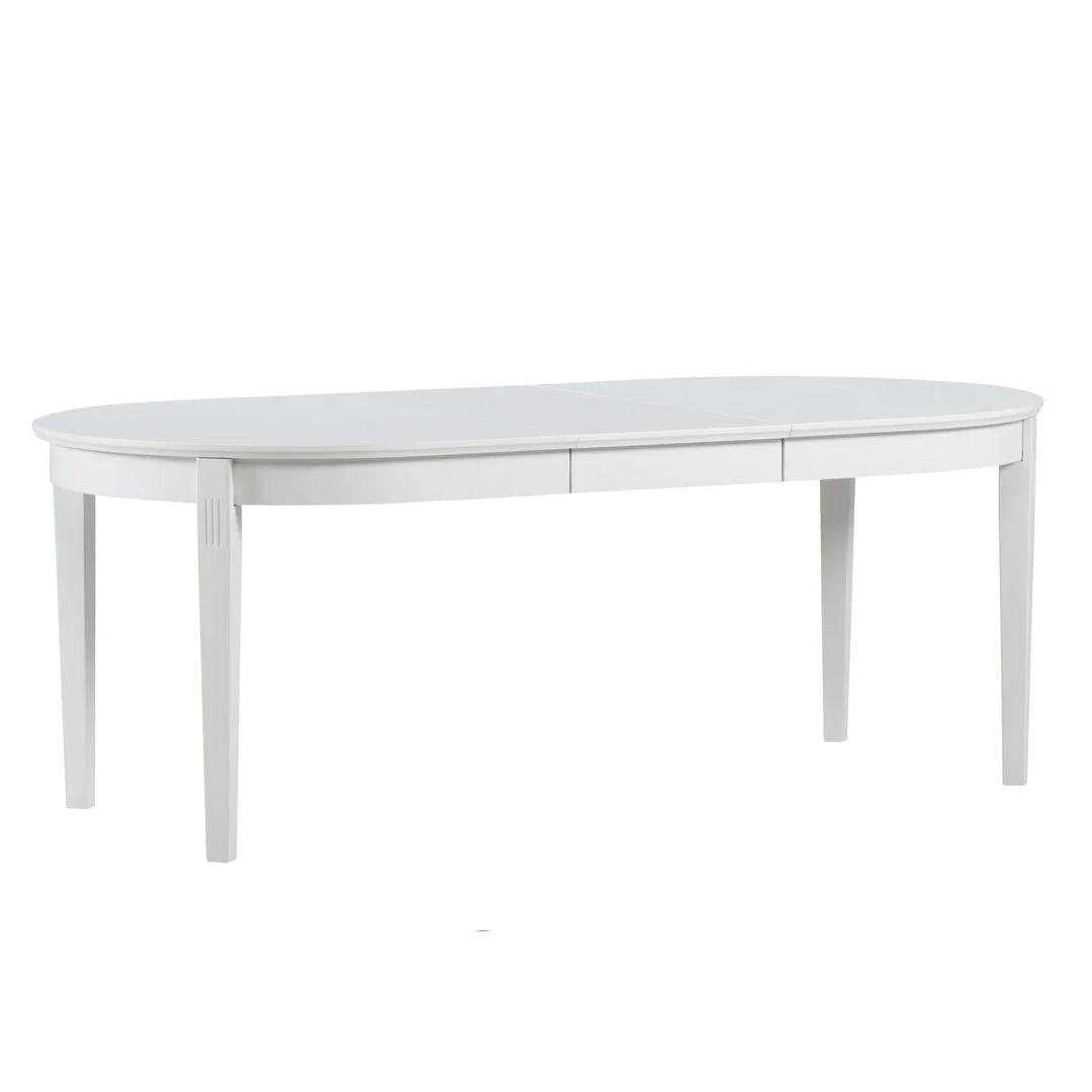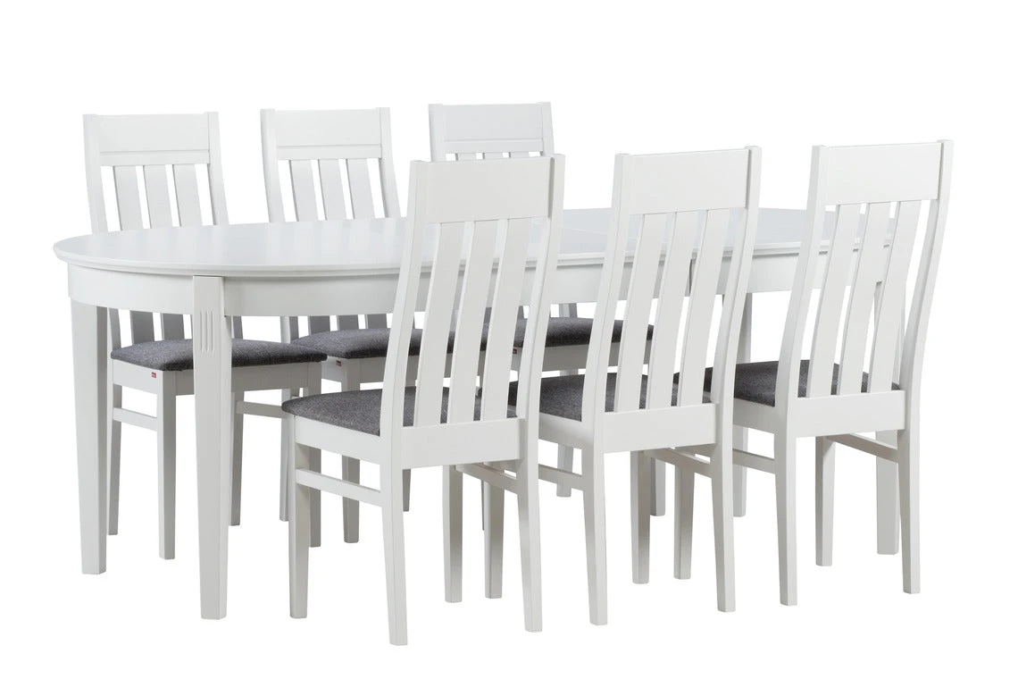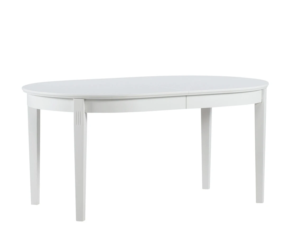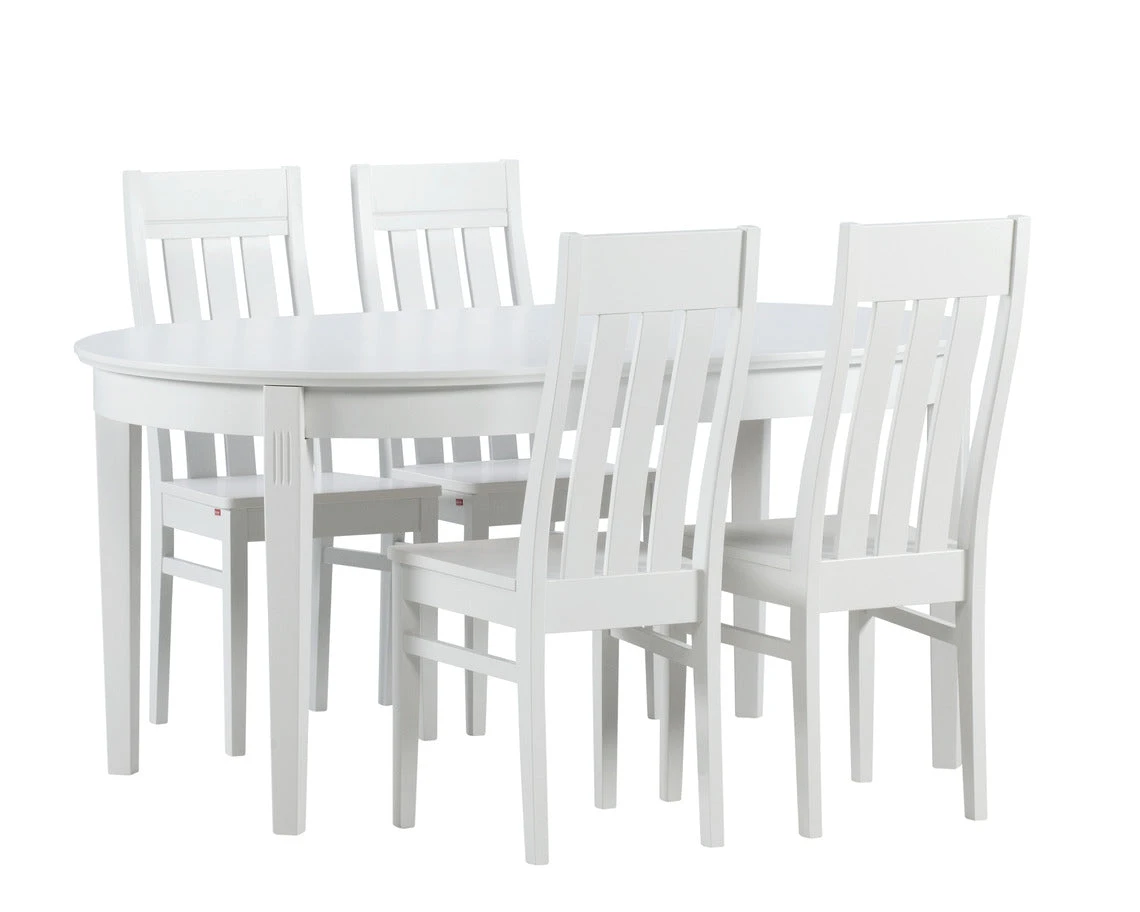 Ovaalinmuotoinen Kanerva-ruokapöytä henkii arvokkuutta ja kutsuu tunnelmalliselle illalliselle. Pöydän ääressä viihtyy oman perheen kesken ja kun vieraita tulee kylään, saa siihen jatko-ominaisuudella lisäpaikkoja. Ruokailijoita sopii pöydän pitkille sivuille tavallisesti neljä ja jatko-osan ollessa käytössä kuusi. Kanerva-ruokapöydässä on sirot alaspäin kapenevat jalat ja niiden yläosassa on yksityiskohtana kauniit koristeurat. Valkoisen pöydän runko on vahvaa massiivikoivua ja kansi kestävää mdf-huonekalulevyä.