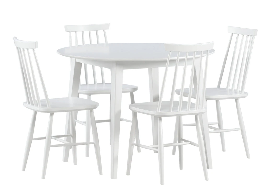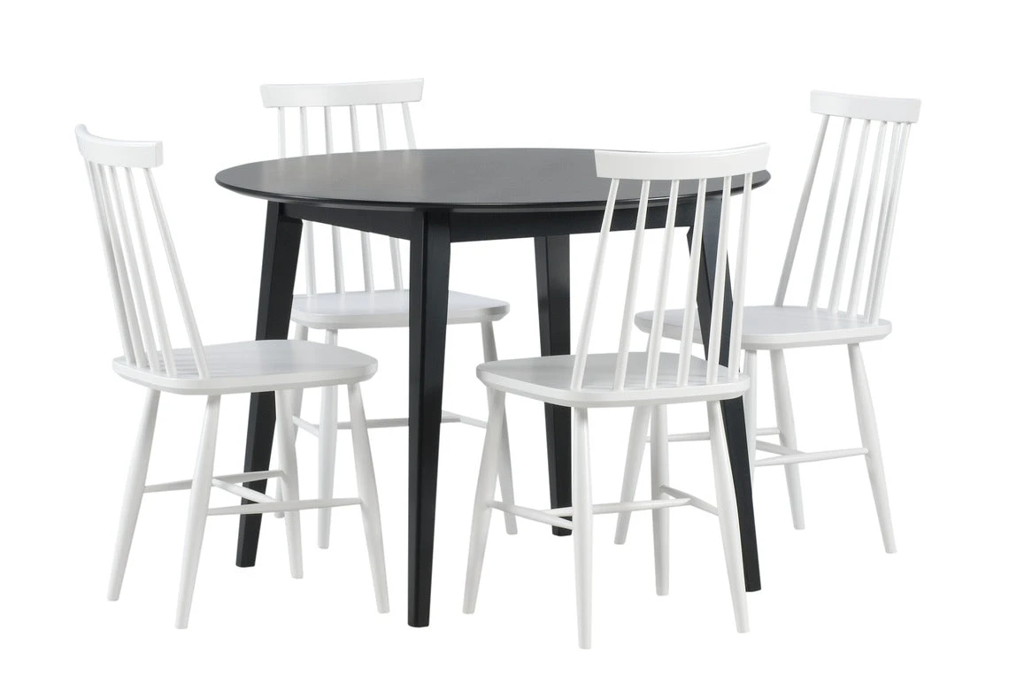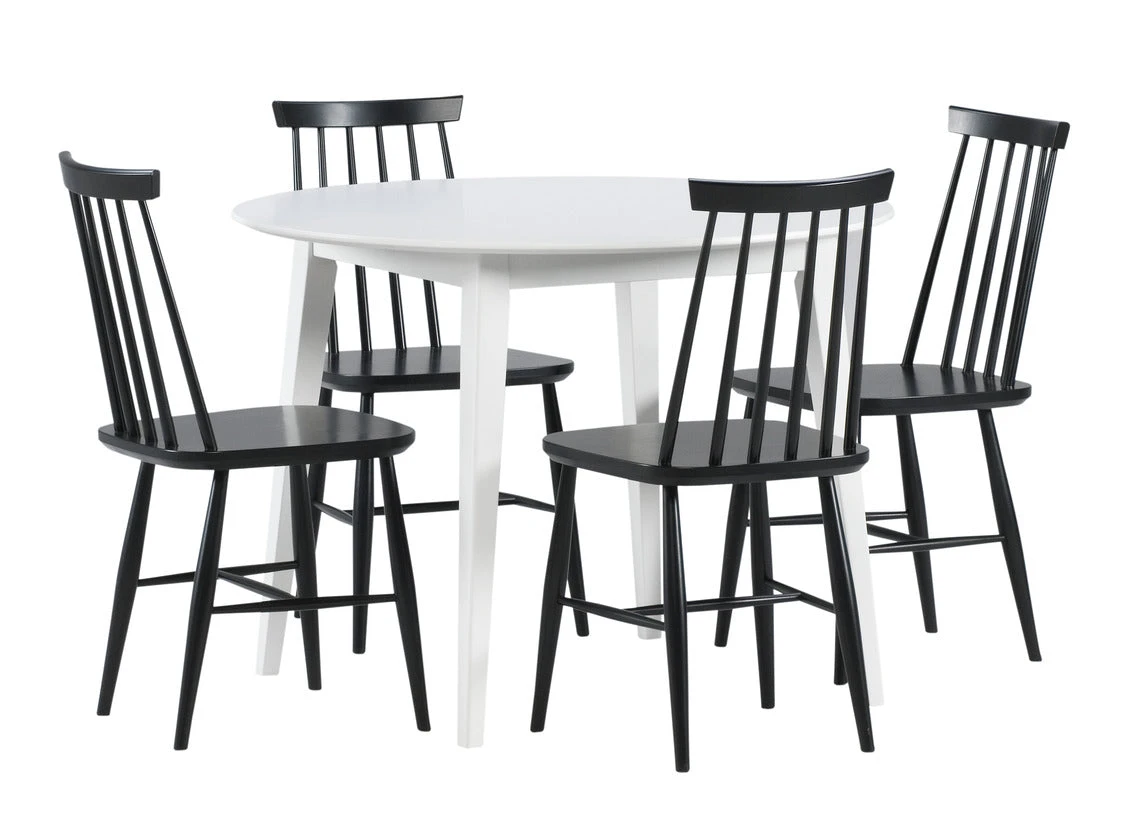 Pyöreän Laine/Ahven-ruokailuryhmän retrohenkinen muotoilu pinnatuoleineen kutsuu kokeilemaan ja leikittelemään ruokailutilan sisustuksella. Ole rohkea ja päästä luovuutesi valloilleen! Mustaa ja valkoista pöytää ja tuolia on helppo yhdistellä moderniin sisustukseen sinulle sopivalla tavalla. Laadukkaan Laine-pöydän runko on kestävää massiivikoivua ja kansi maalattua mdf-huonekalulevyä. Klassinen Ahven-pinnatuoli on jälleen muodissa ja haluttu vaihtoehto ruokailutilan sisustukseen. Ruokaryhmän ääreen mahtuu ruokailemaan neljä henkilöä.