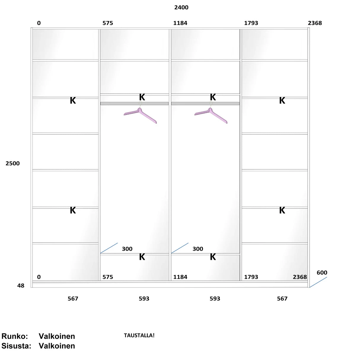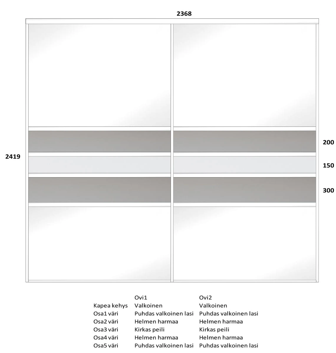 Kuvissa on yksi mahdollinen esimerkkikokoonpano Lakeus Design -liukuovikomerosta. Esimerkkikaapissa on tuotekuvissa esitellyt materiaalit sekä sisustan tarvikkeet. Erilaiset materiaalivalinnat ja sisustaan valitut varusteet vaikuttavat komeron hintaan.