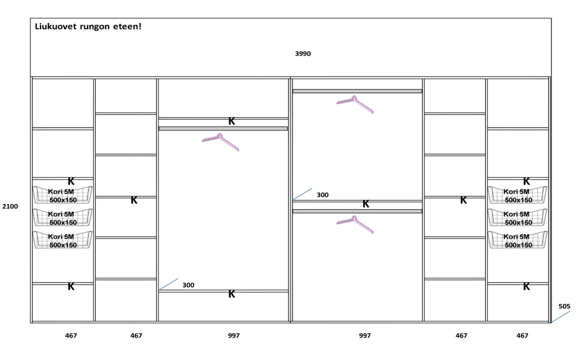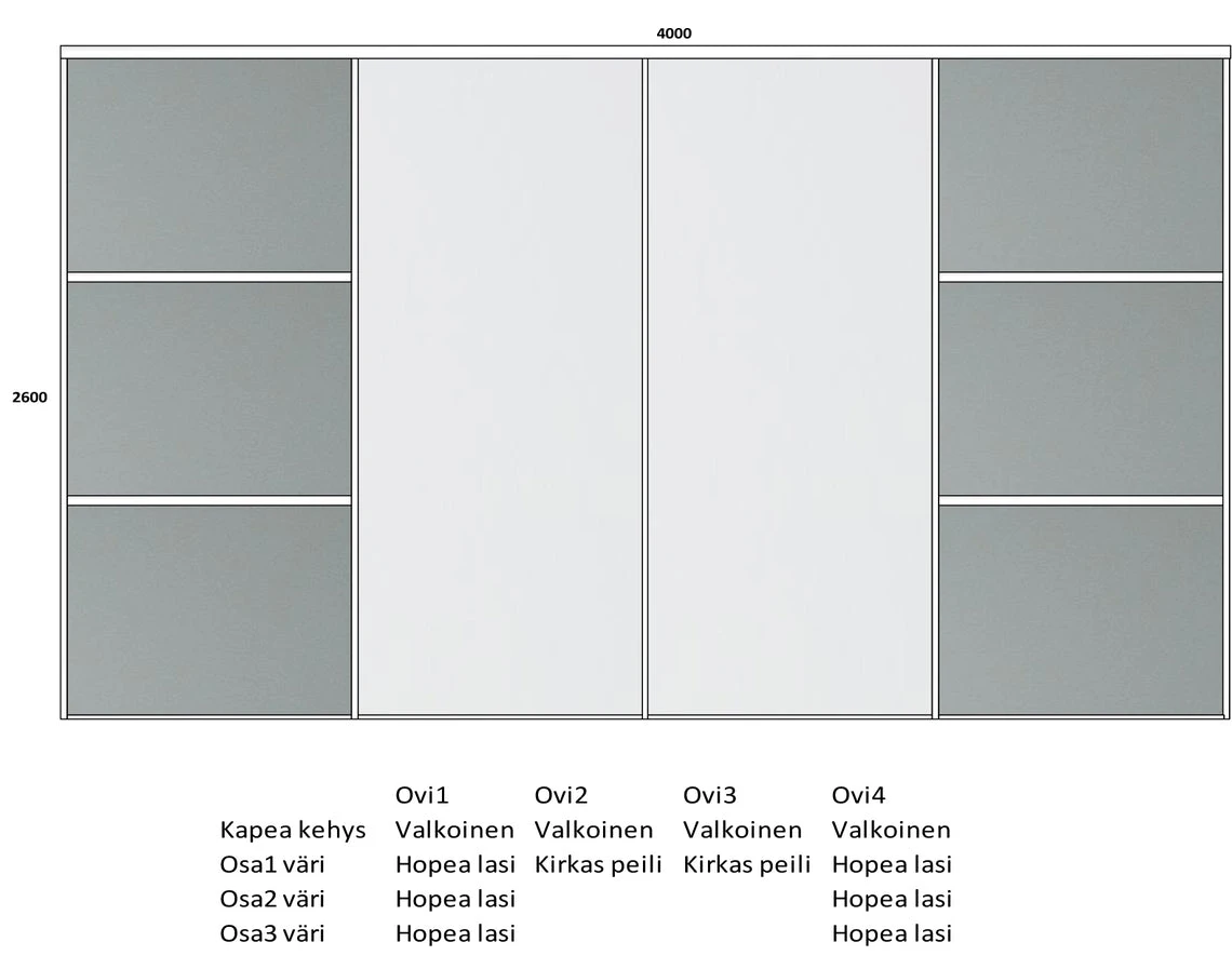 Kuvissa on yksi mahdollinen esimerkkikokoonpano Lakeus Design -liukuovikomerosta. Esimerkkikaapissa on tuotekuvissa esitellyt materiaalit sekä sisustan tarvikkeet. Erilaiset materiaalivalinnat ja sisustaan valitut varusteet vaikuttavat komeron hintaan.