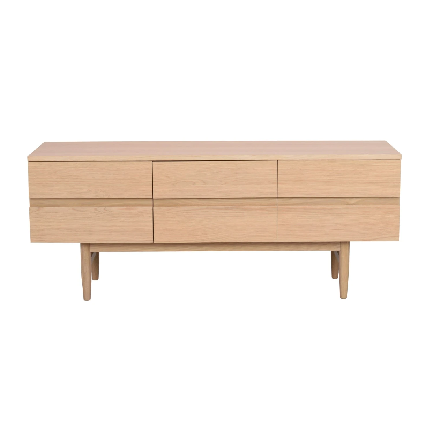 Matala tv-taso on valmistettu vaaleaksi lakatusta MDF-tammiviilusta ja sen ohuet puujalat tuovat muuten jykevään säilytyskalusteeseen ilmavuutta ja keventävät ulkoasua, sekä helpottavat siivousta. Pehmeästi sulkeutuvat Soft-Close-mekanismilla toimivat ovet lisäävät käyttömukavuutta. Ovissa on keskellä vetimien sijaan koristeellinen sormiura.Â
