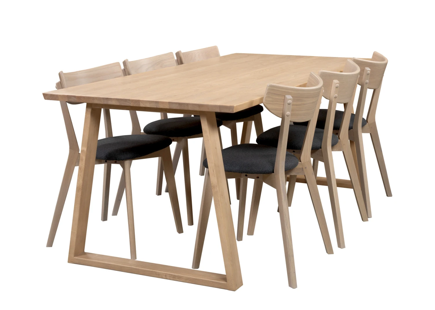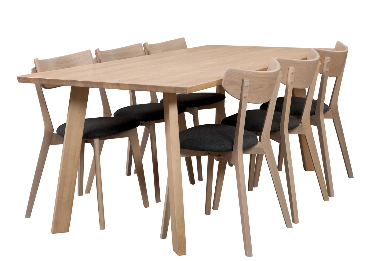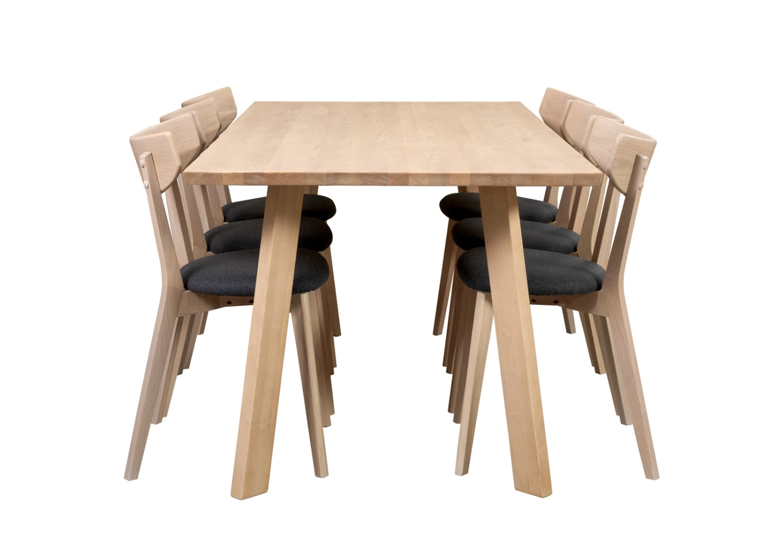 Aikaa kestävässä ruokaryhmän Swing-pöydässä on koivukansilevy, jolle voit valita puiset viistejalat tai vinot yksittäiset jalat. Puhdaslinjainen Swing-pöytä tuo modernia ilmettä ruokaryhmään, jonka viimeistelevät ruotsalaisen Rowicon klassiset Ami-tuolit.