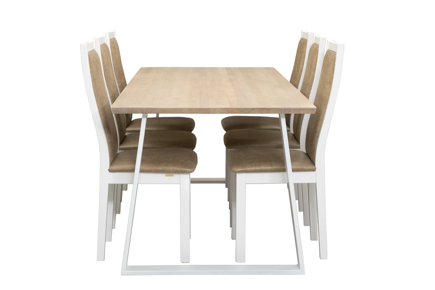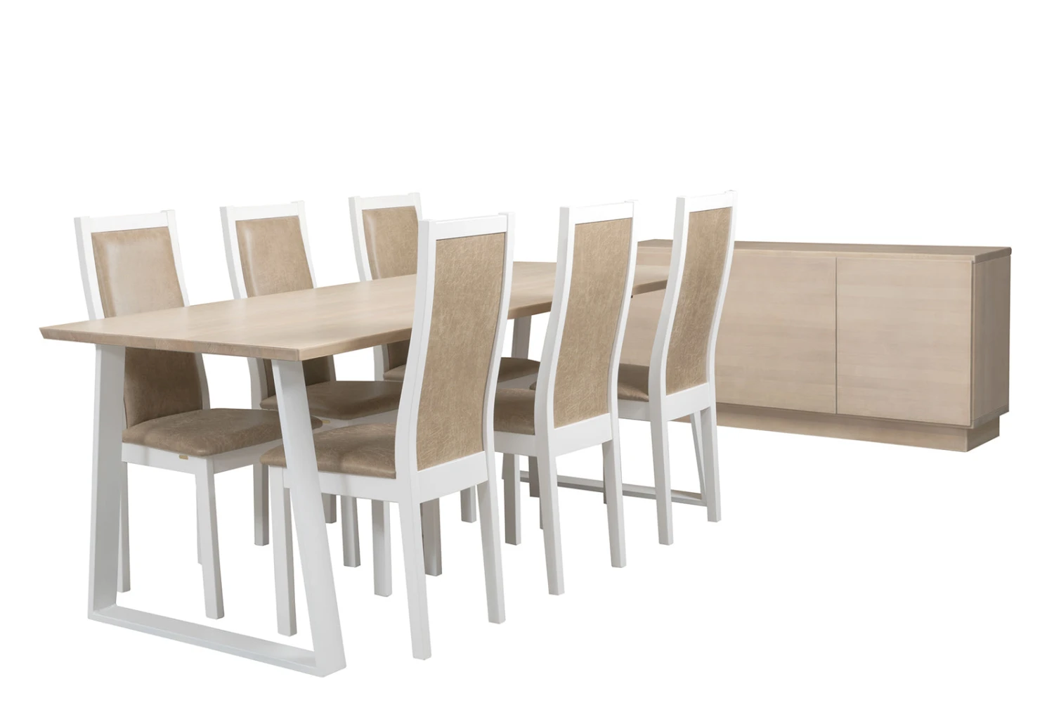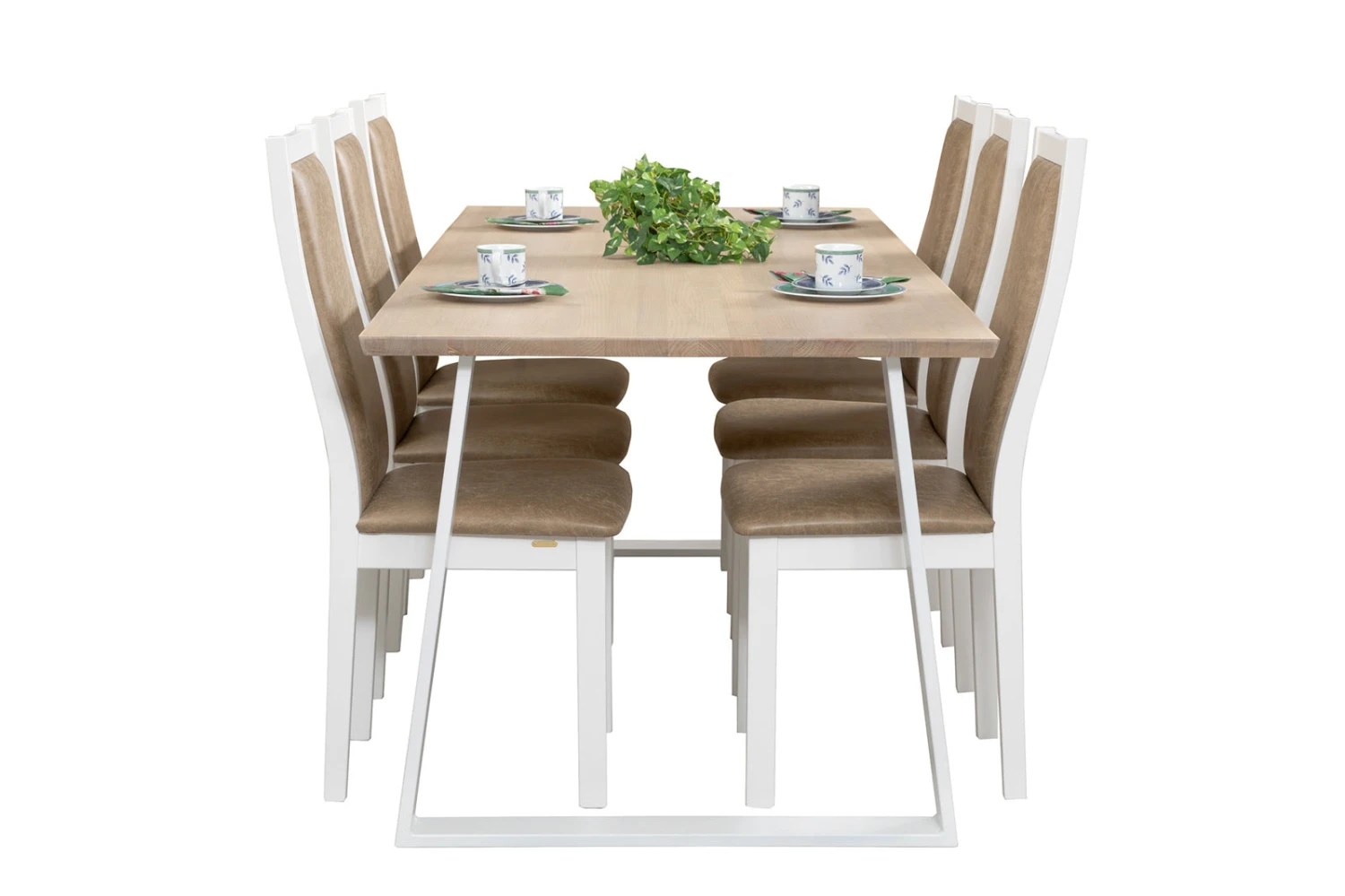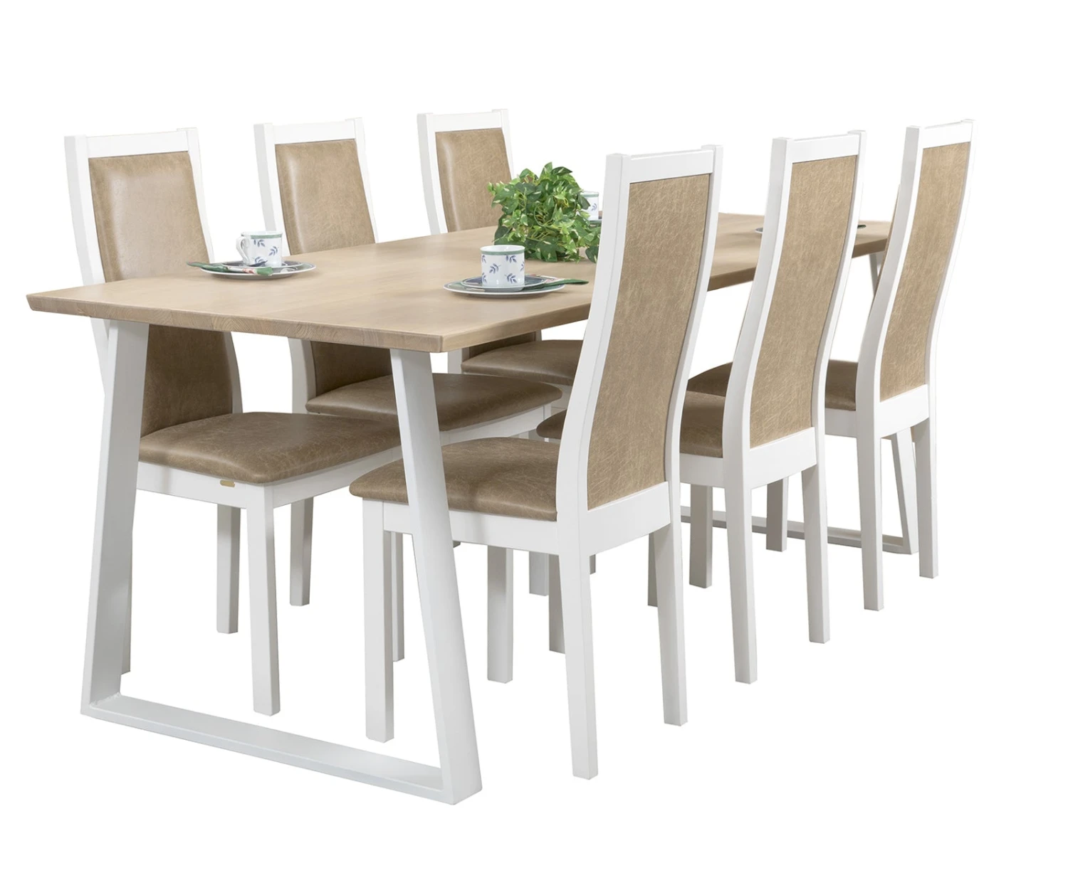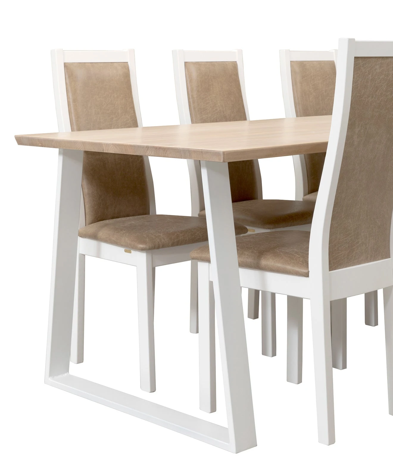 Swing-kalustesarjan Pohjola-tuolissa on istumamukavuus kohdillaan – tämän takaa tuolien verhoiltu istuin- ja selkänojaosa. Upeassa nahkaverhoillussa Pohjola-ruokapöydän tuolissa on kauniisti muotoiltu umpipuinen peittovalkoinen mäntyrunko, joka kestää katsetta ja käyttöä. Puhdaslinjainen Pohjola-tuoli tuo pöytäryhmään eleganttia ilmettä.