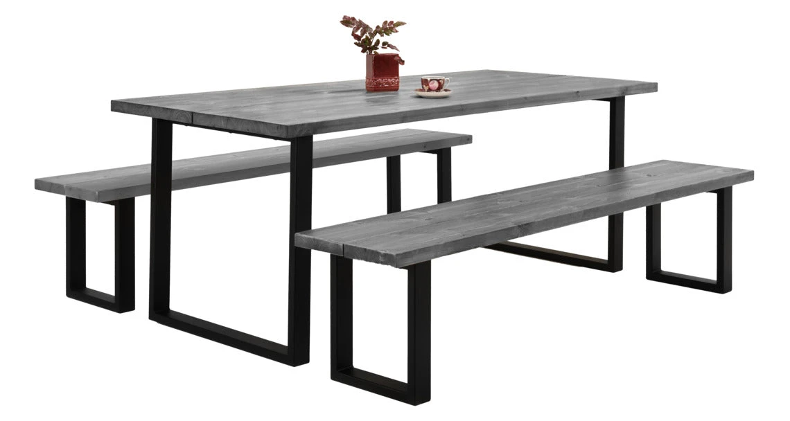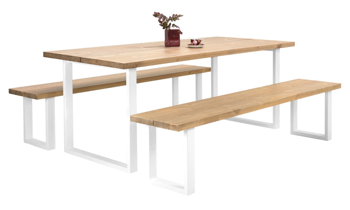Upea Venla-penkkiryhmä on nykyaikainen versio perinteisestä pirttikalustosta. Se on näyttävä ilmestys ja sopii sekä sisä- että ulkokäyttöön. Saat räätälöityä mieleisesi version pöydästä ja penkeistä valitsemalla kansivärin sekä jalkamallin ja jalkojen värin. Tässä Venla-penkkiryhmän mallissa on suorat metallijalat. Kahdesta lankusta valmistettu pöydänkansi ja penkin istuin ovat vahattua ja harjattua massiivimäntyä.