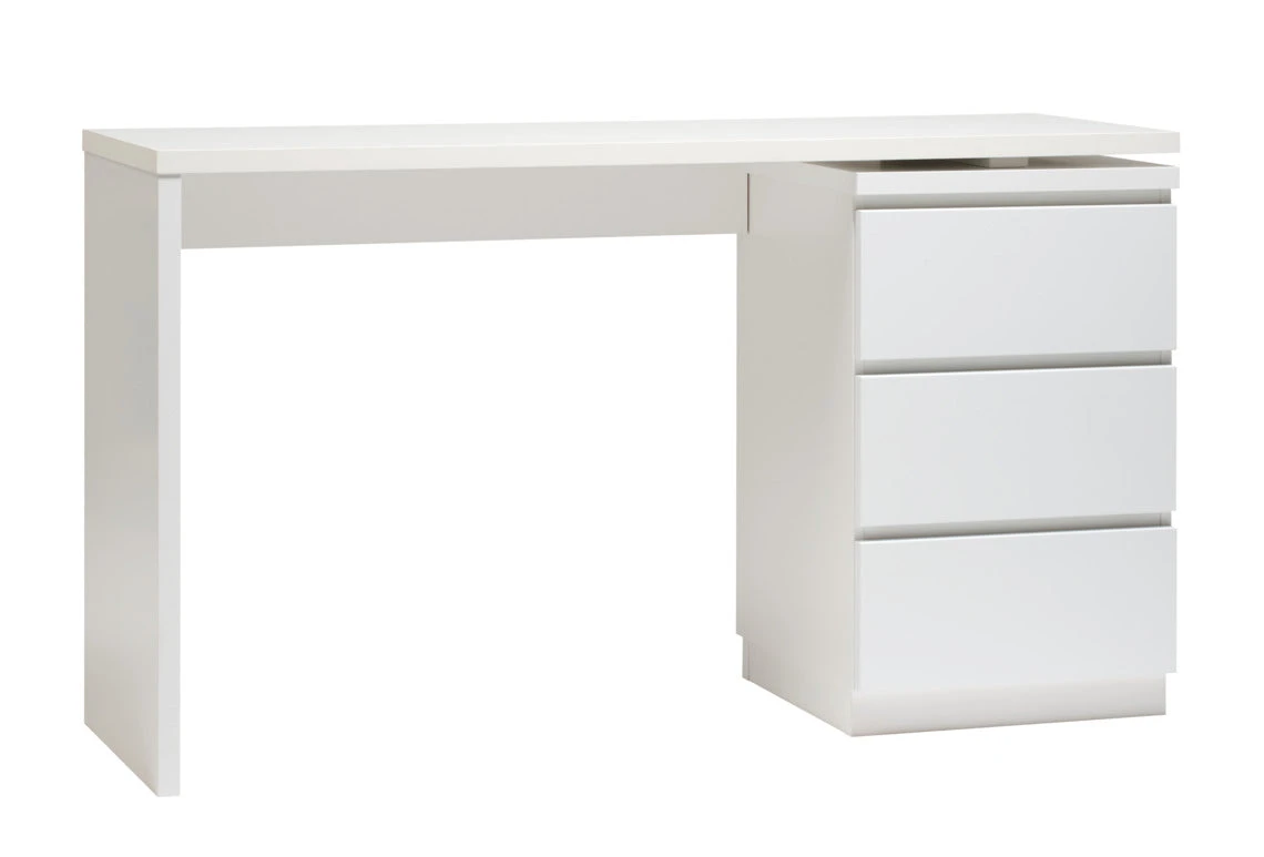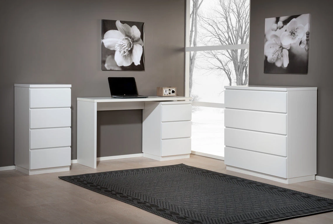 Monipuolinen Viiva-työpöytä saadaan asettamalla jalallinen kirjoitustaso ilman kiinnitystä 3-laatikkoisen valkoisen sokkelijalallisen lipaston päälle. Tarpeen tullen lipaston voi siis ottaa käyttöön helposti myös ilman kirjoitustasoa. Lisävarusteena on saatavana valkoinen lasikansi työtason päälle.