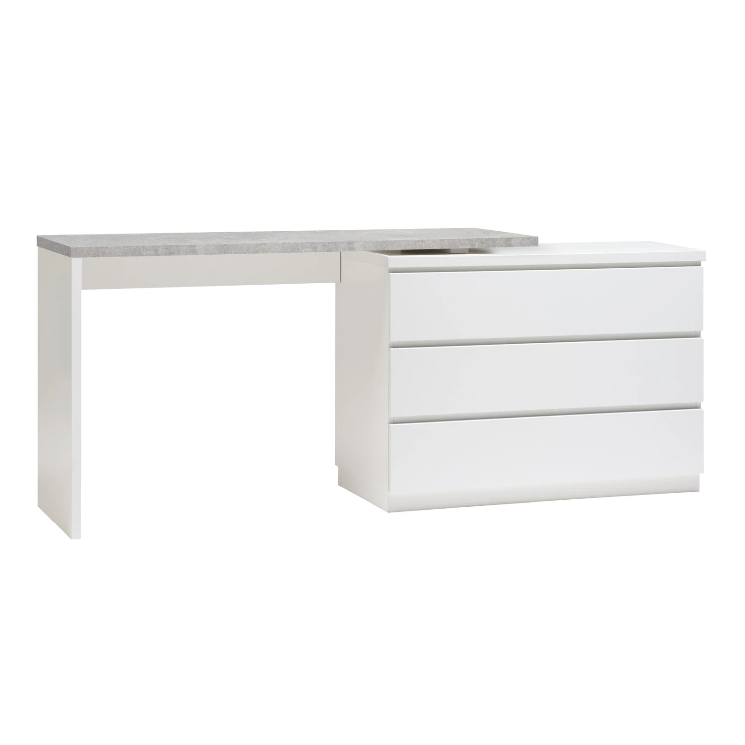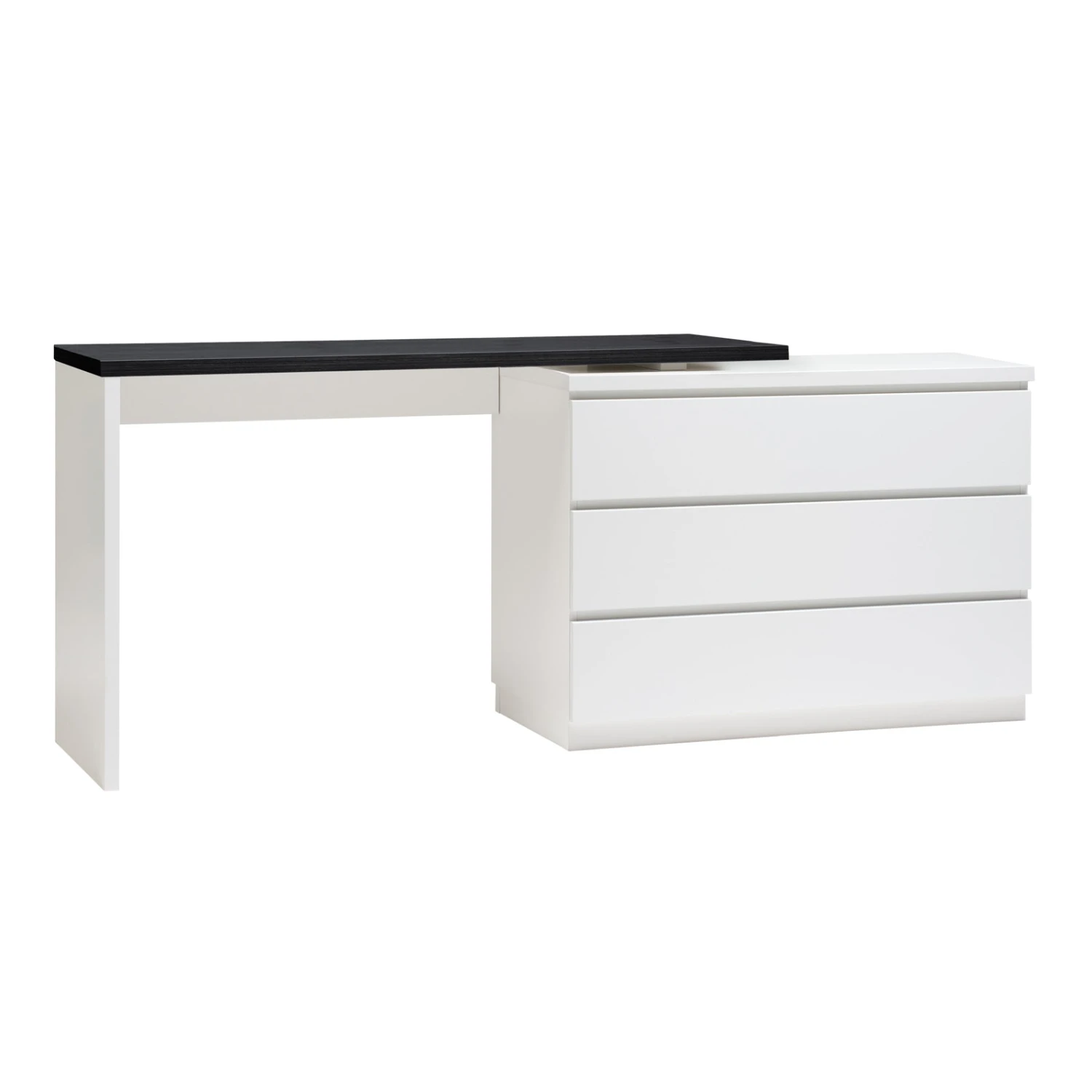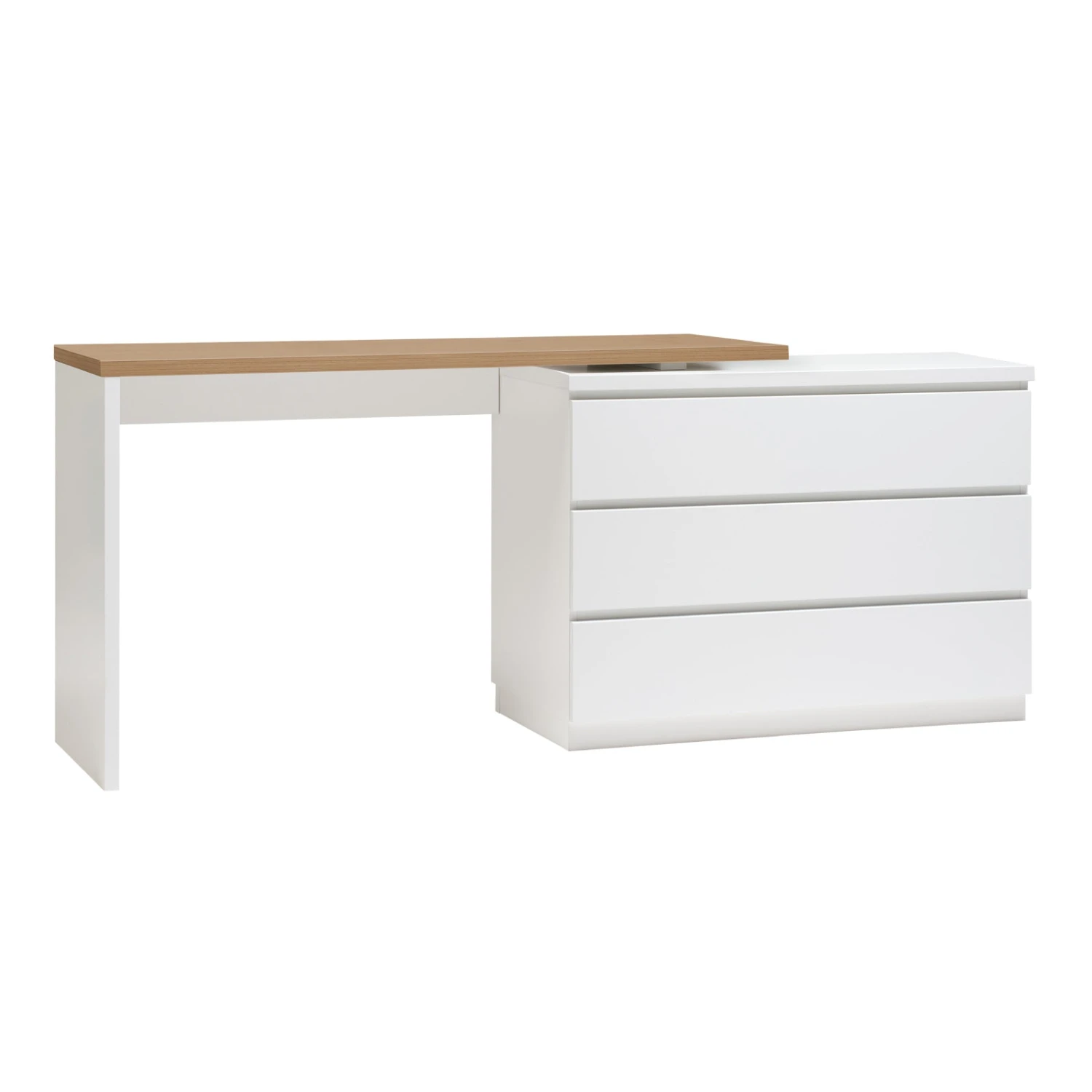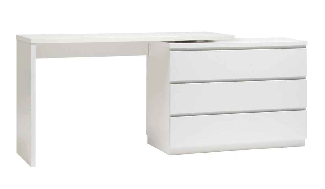 Monipuolinen Viiva-työpöytä saadaan asettamalla jalallinen kirjoitustaso ilman kiinnitystä valkoisen 3-laatikkoisen sokkelijalallisen lipaston päälle. Tarpeen tullen lipaston voi siis ottaa käyttöön helposti myös ilman kirjoitustasoa. Lisävarusteena on saatavana valkoinen lasikansi työtason päälle.