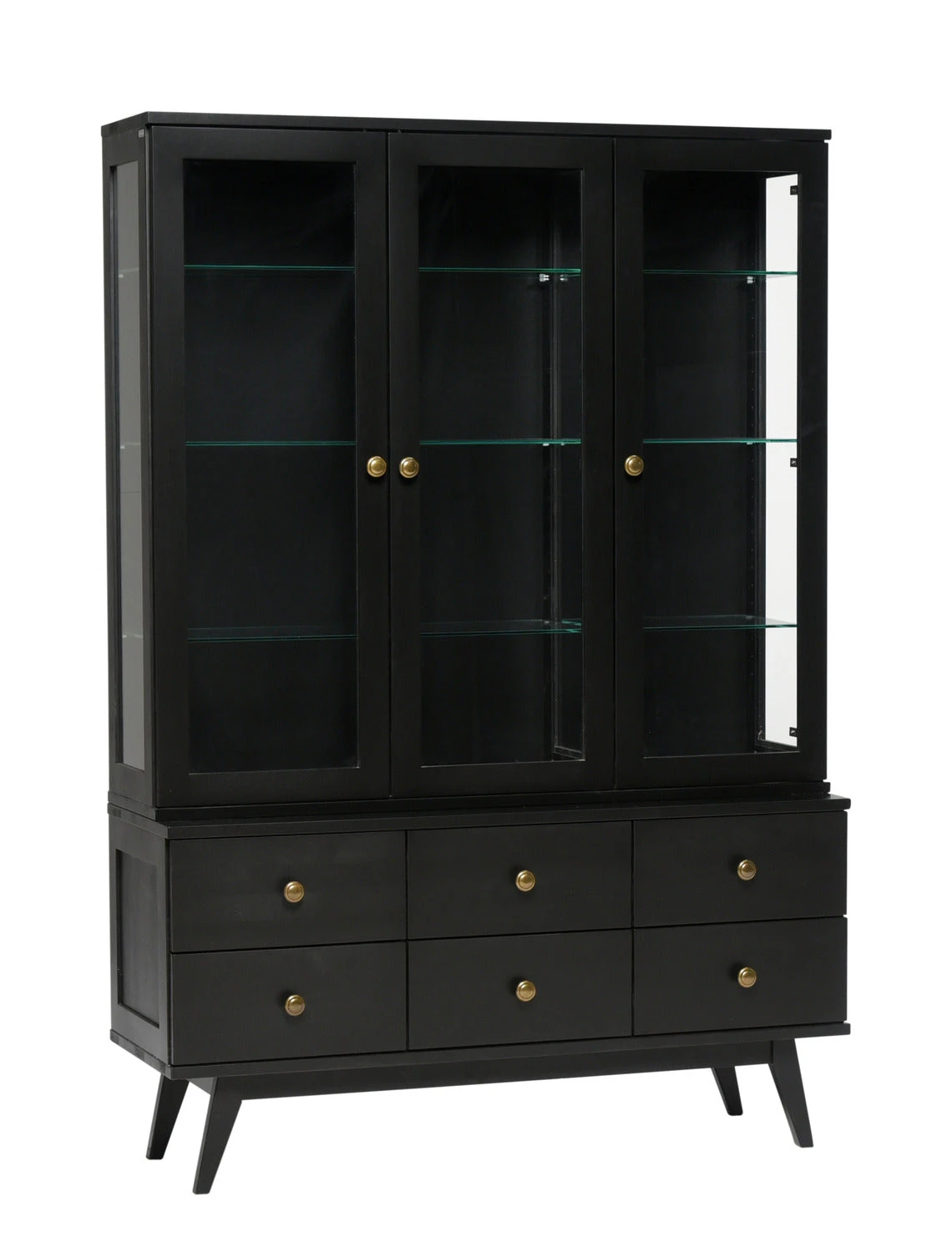 Vuokatti-sarjan korkeassa ja leveässä vitriinissä tavarat pysyvät järjestyksessä monipuolisen säilytystilan ansiosta. Ylempään kolmen oven lasikaapistoon saa näyttävästi esille kauneimmat koriste-esineet ja valokuvakehykset. Alaosan kuuden laatikon laatikostoon on näppärä lajitella tavarat niin, että ne myös löytyvät. Näyttävän vitriinin yhdistäminen muihin Vuokatti-kalusteisiin on helppoa.