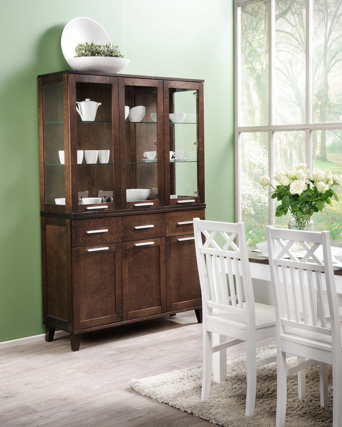Vuokatti-sarjan korkeassa ja leveässä vitriinissä tavarat pysyvät järjestyksessä monipuolisen säilytystilan ansiosta. Ylempään kolmen oven lasikkoon saa näyttävästi esille kauneimmat koriste-esineet ja valokuvakehykset. Pienille tavaroille Vuokatti-vitriini tarjoaa säilytystilan vetolaatikoiden muodossa. Isommille esineille, kuten vaikkapa astioille, on ovellista kaappitilaa. Näyttävän vitriinin yhdistäminen muihin Vuokatti-kalusteisiin on helppoa.