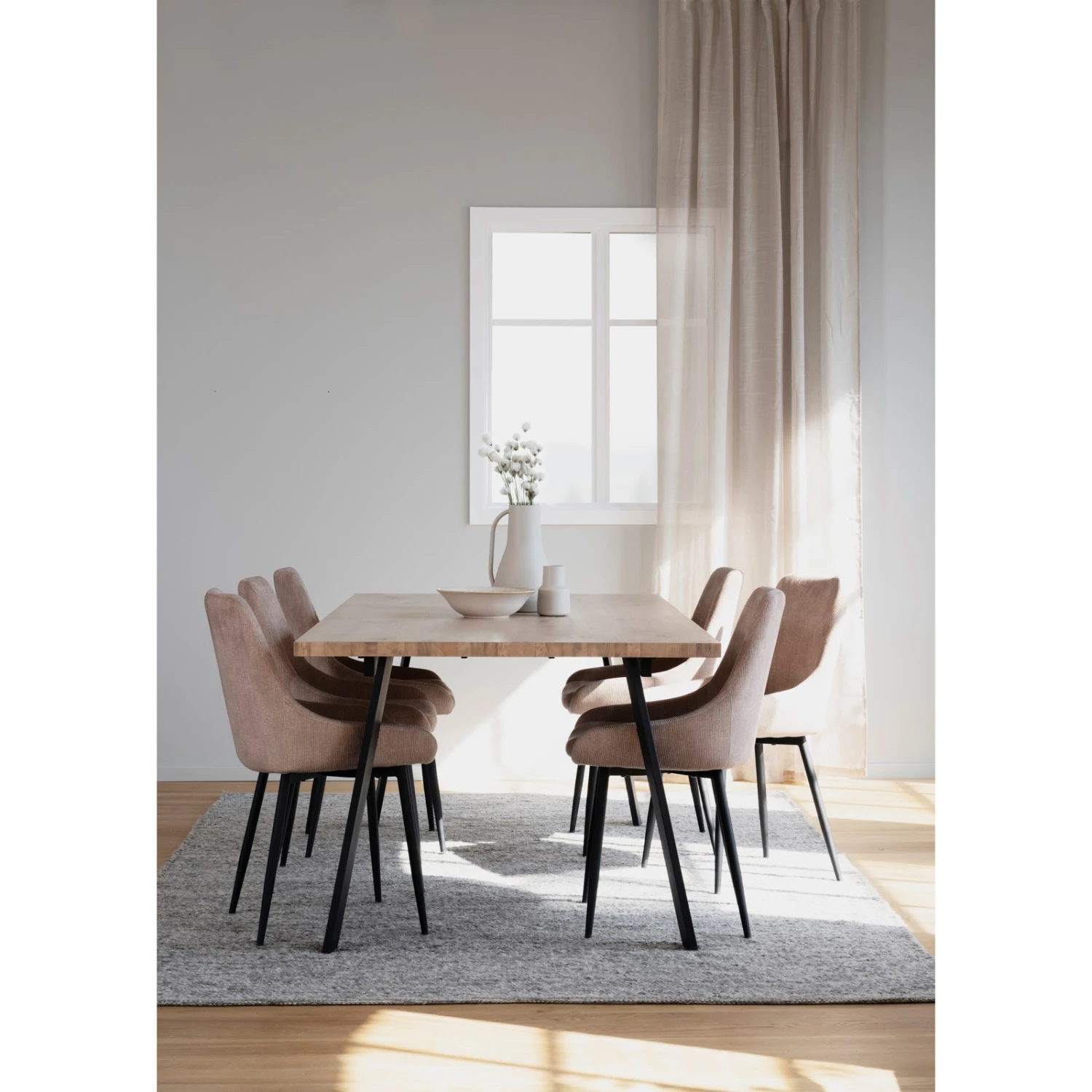 Suoralinjainen Winnipeg-ruokapöytä luo ruokailutilaasi tyylikästä tunnelmaa! Trendikäs viilutettu kansi yhdistettynä mustiin metallijalkoihin sopii erinomaisesti skandinaaviseen sisustustyyliin ja tuo eloa ruokailutilaan. Pöydän kansi on lakattu, mikä helpottaa luonnonmateriaalin puhtaana pitämistä – pyyhi kuivaksi puristetulla liinalla kannelle läikähtäneet roiskeet.